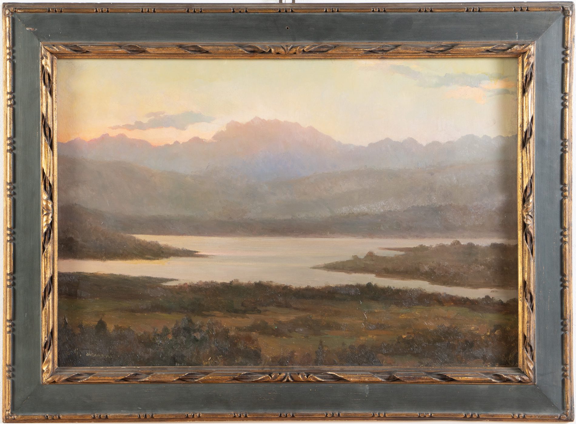 Giuseppe Talamoni (Monza 1886 - Varese 1968), “Paesaggio lacustre”.Olio su tavola, firmato in