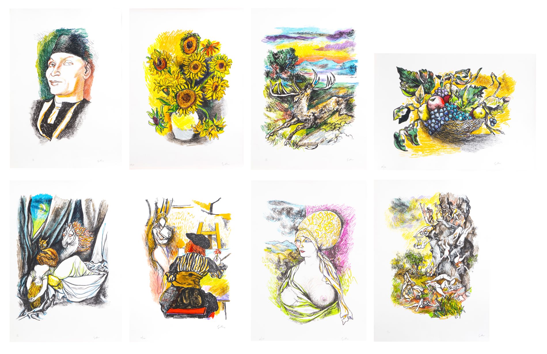 Renato Guttuso (Bagheria 1911 - Roma 1987), Cartellina artistica.Contenente otto litografie a colori originali firmate dall’artista con numero di tiratura 48/100, recano timbro a secco La Spirale - Milano: 1-Omaggio a Antonello da Messina, 2- Omaggio a Albrecht Durer, 3-Omaggio a Albrecht Durer, 4-Omaggio a Michelangelo da Caravaggio, 5-Omaggio a Jan Vermeer, 6-Omaggio a Henry Fuesli, 7-Omaggio a Gustave Courbet, 8-Omaggio a Vincent Van Gogh, H cm 70x49 (entro cartellina originale)