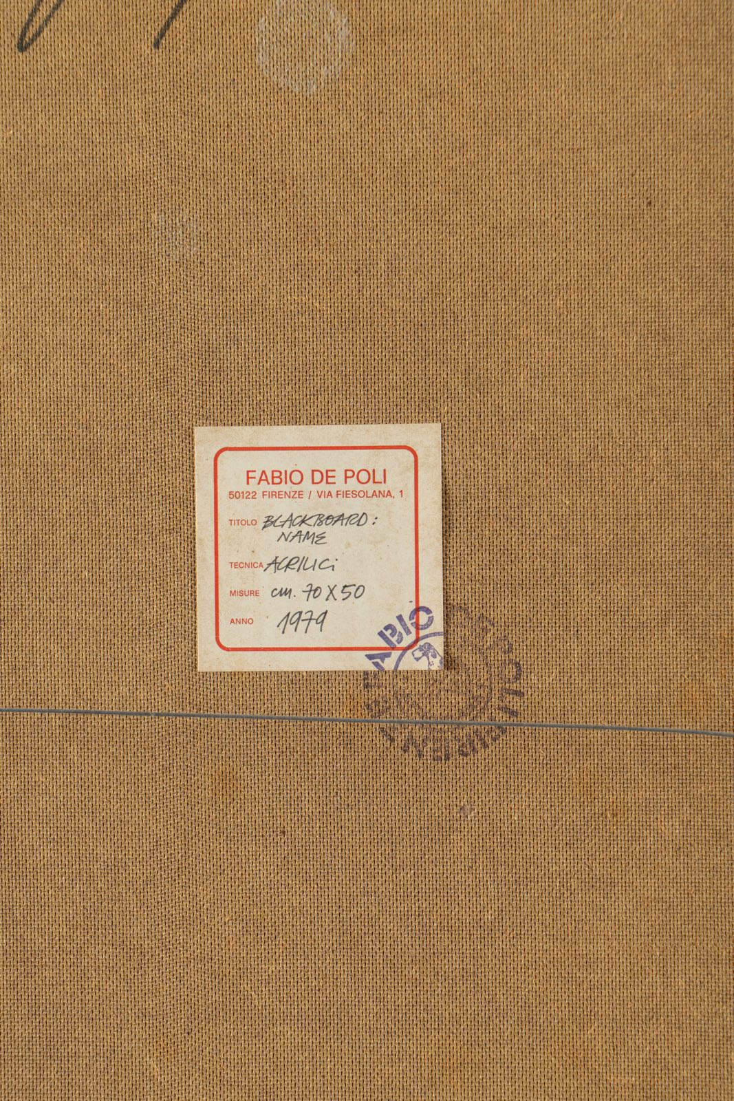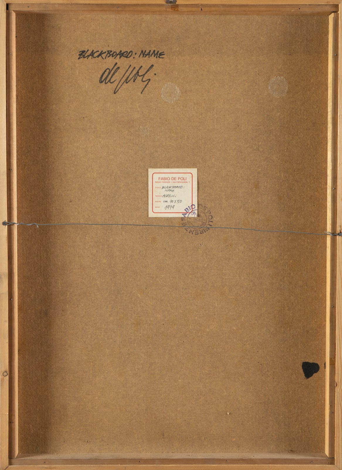 Fabio de Poli (Genova 1947), “Blackboard: name”, 1979.Acrilici su masonite, reca al retro titolo e firma e timbro ed etichetta dell’artista con titolo, tecnica, misure ed anno. H cm 70x50, H cm 73x53x6