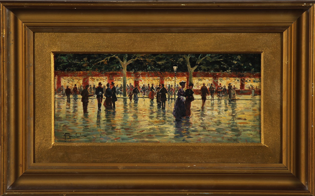 ANONIMO Strada con personaggi. Olio su tavola. Cm 34,00 x 15,00. Firmato in basso a sinistra. Cornice presente