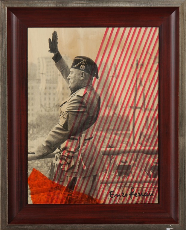 FERRARI ENZO Il Duce. Tecnica mista su tavola. Cm 30,00 x 40,00. Firma in basso a destra. Al retro firma per autentica e timbro dell'Associazione nazionale amici de Il Quadrato. Autentica dell'artista su fotografia. In allegato all'opera copia del depliant relativo alle opere di Enzo Ferrari, realizzato dall'Associazione nazionale amici de Il Quadrato, firmato dall'artista. Cornice presente