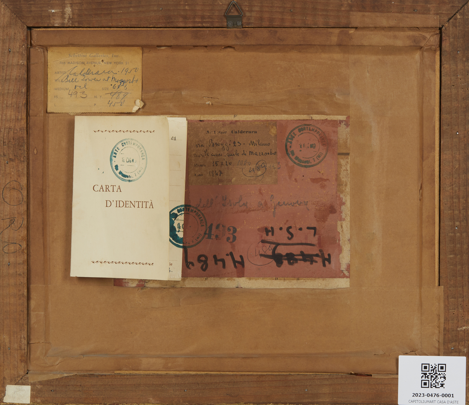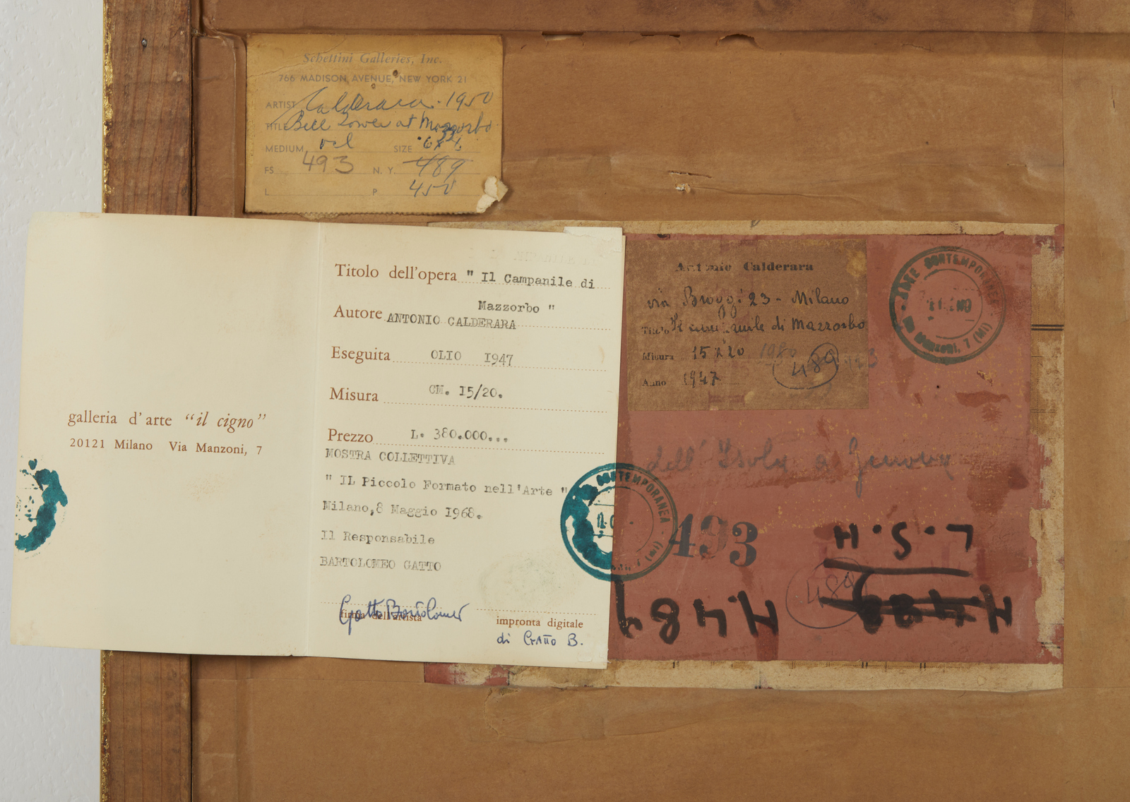 CALDERARA ANTONIO (1903 - 1978) Il campanile di Mazzorbo. 1947. Olio su tavola. Cm 20,00 x 15,00. Firma in basso a sinistra. Al retro cartiglio Schettini Galleries, New York, cartiglio Galleria d'arte Il Cigno, Milano e cartiglio descrittivo dell'artista. Opera archiviata presso la Fondazione Antonio e Carmela Calderara, Milano, come da documentazione fotografica allegata all'opera riportante il relativo numero d'inventario. Provenienza: Schettini Galleries, New York; Galleria Il Cigno, Milano; Collezione privata, Brescia. . Cornice presente