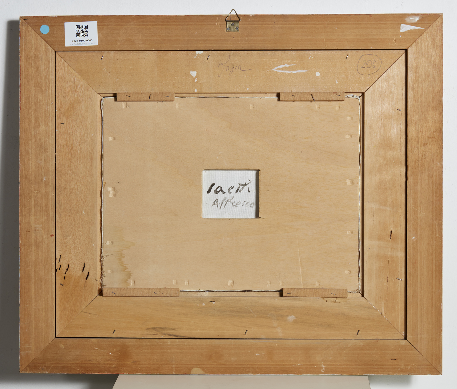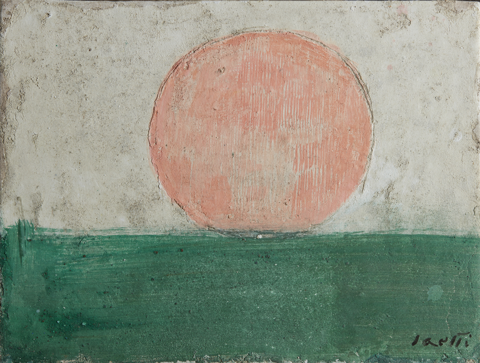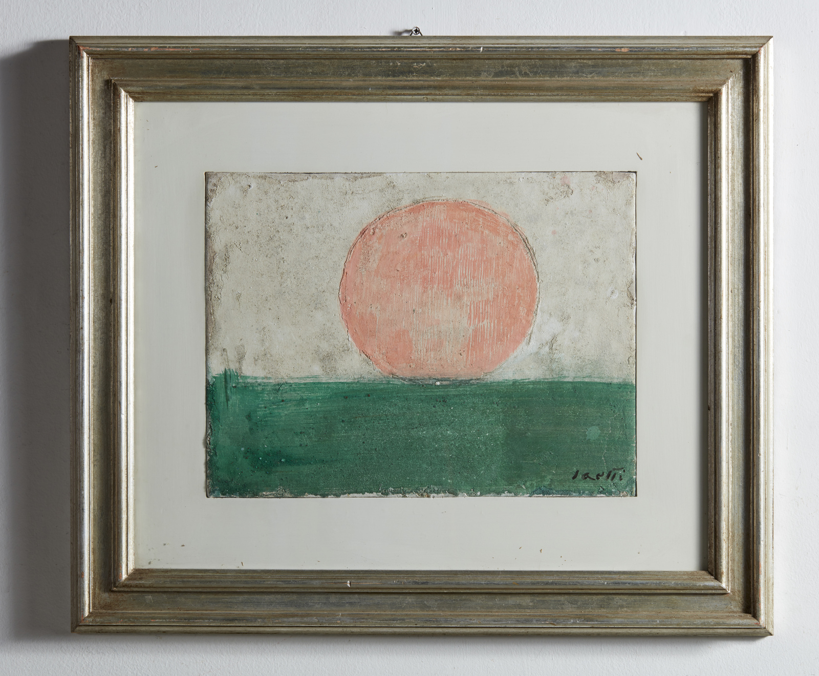SAETTI BRUNO (1902 - 1984) Paesaggio con sole (bozzetto). Affresco su tela. Cm 41,00 x 31,00. Firma in basso a destra e al retro. Opera archiviata presso l'Archivio Storico Artisti Veneti, Mestre, come da documentazione fotografica allegata all'opera riportante il relativo numero d'inventario. Anni'70. Cornice presente