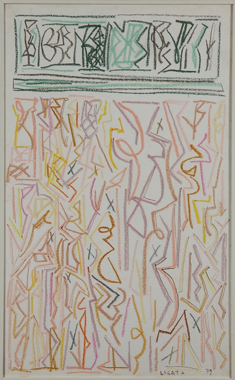 LICATA RICCARDO (n. 1929) Senza titolo. 1979. Tecnica mista su carta su tela. Cm 40,00 x 65,50. Firma e data in basso a destra. Autentica dell'artista su fotografia. Certificato di autenticità a cura di Telemarket spa, Roncadelle (BS). Imprecisione riguardante la misura dell'altezza presente nell'autentica e nel certificato di autenticità. Opera pubblicata sul catalogo della mostra Licata, cinquant'anni di diari su carta, Archivio di Stato di Firenze, da dicembre 2001 a gennaio 2002, a cura di Giovanni Granzotto, Verso l'Arte Edizioni, pag. 45. Cornice presente