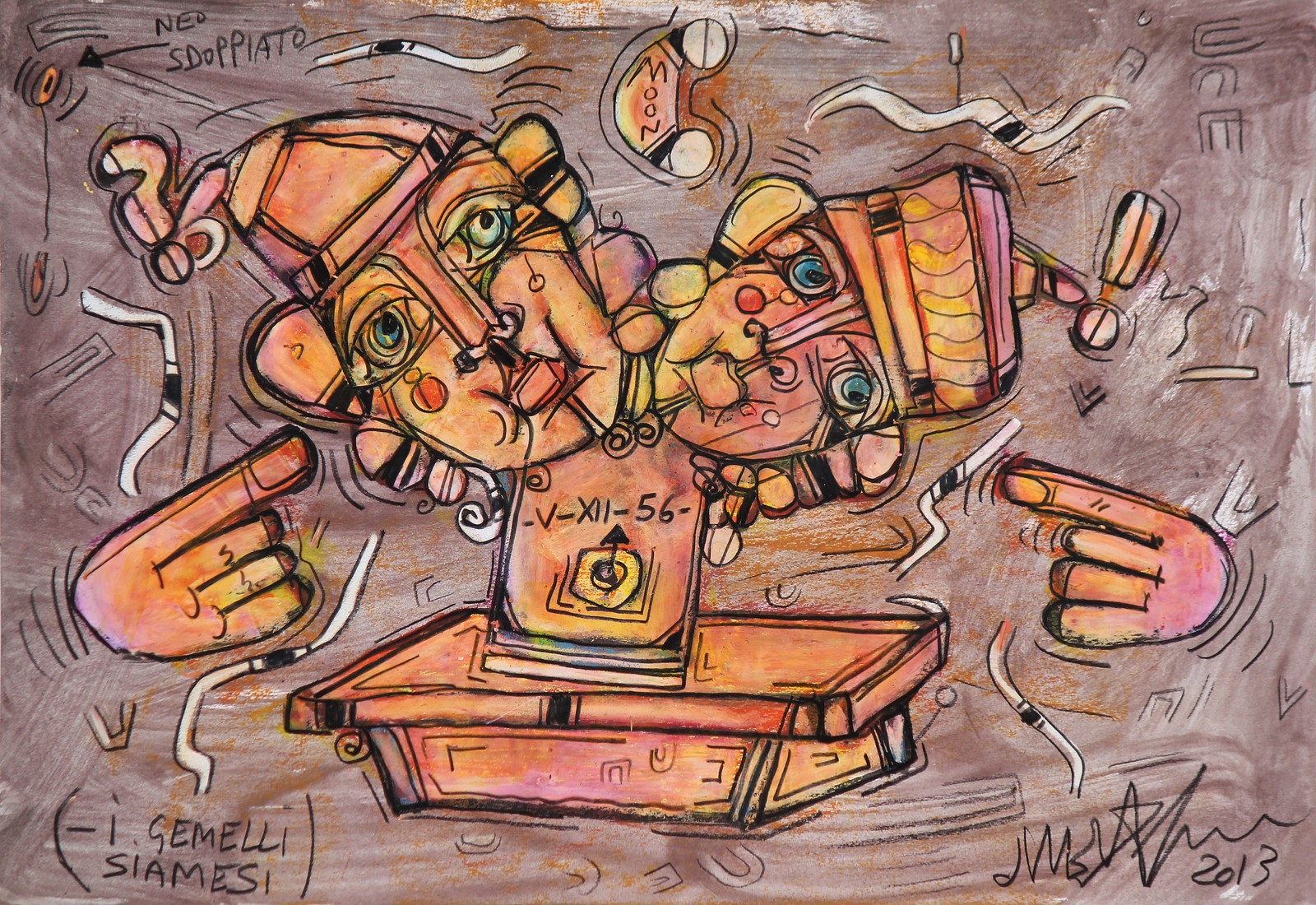 DELEGO MARTINO (n. 1956) I gemelli siamesi. 2013. Tecnica mista su carta. Cm...