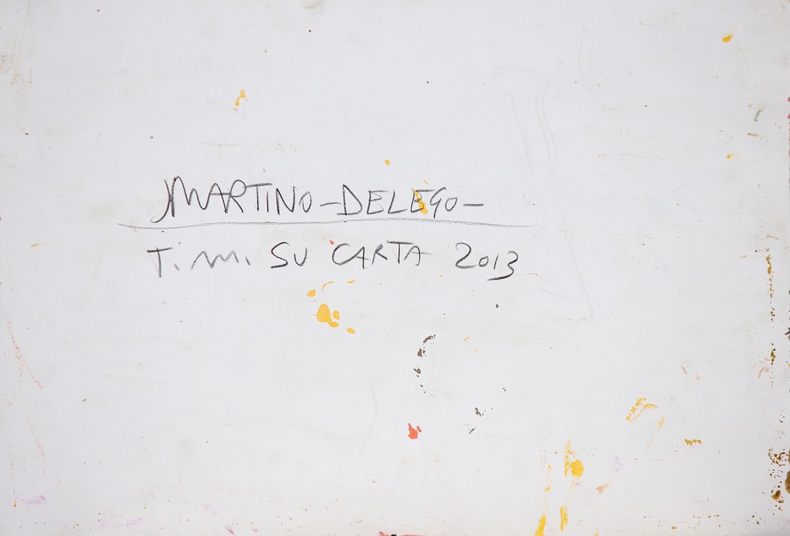 DELEGO MARTINO (n. 1956) L'amore x un pesce. 2013. Tecnica mista su carta. Cm 47,50 x 33,00. Firma e data in basso a destra. Al retro firma e data. Autentica dell'artista su fotografia.