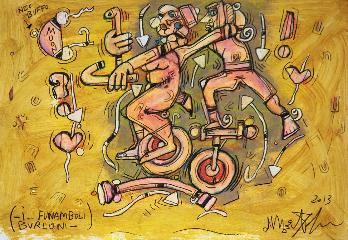 DELEGO MARTINO (n. 1956) I funamboli burloni. 2013. Tecnica mista su carta....