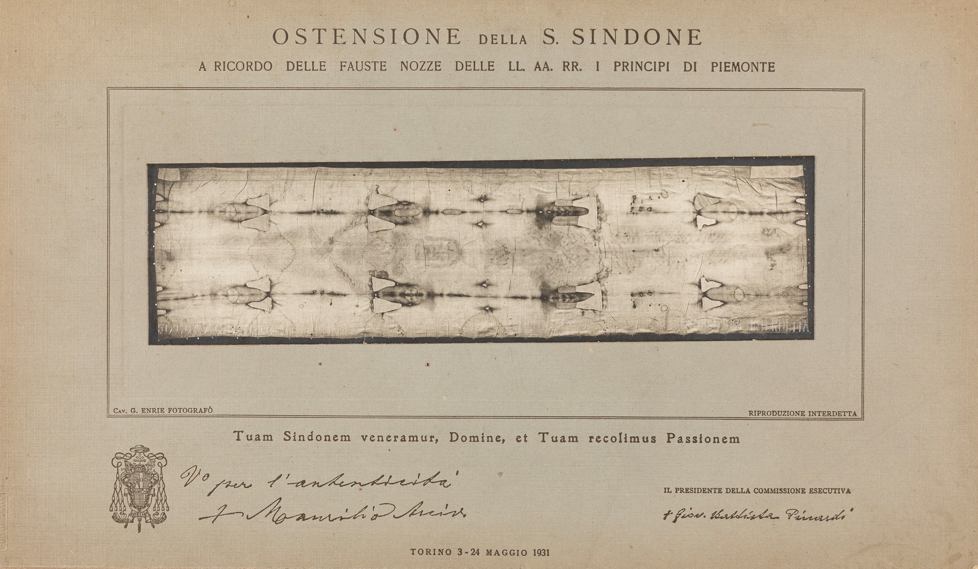 Per molto tempo la Sindone, il discusso lenzuolo presentato come l’originario sudario del corpo di Gesù Cristo, è stato descritto a parole, omaggiato per la sua supposta sacralità, riprodotto in disegni, osservato in occasione delle pubbliche estensioni. Tutto è cambiato con l’avvento della fotografia: è stato il piemontese Secondo Pia nel 1898 a fotografarlo per la prima volta in una complessa sessione dove furono utilizzate per una delle prime volte lampadine da illuminazione. Nel 1931, in occasione dell’estensione di quell’anno, un altro piemontese, Giuseppe Enrie, poté fotografare il lenzuolo senza l’ostacolo della teca che lo preserva. Curioso che tutto avvenisse all’interno del Duomo di Torino dove era stata anche allestita una camera oscura. Anche in questo secondo caso i fotografi hanno sottolineato che l’oggetto ha le caratteristiche di un negativo fotografico.
