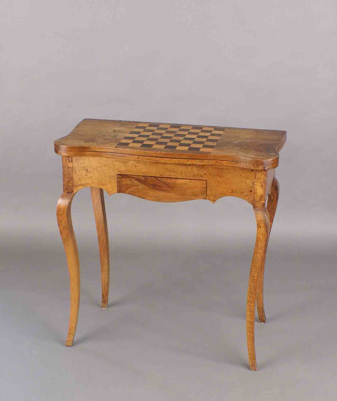 Tavolo da gioco in noce, piano sagomato con scacchiera al centro ed apribile, rivestito in panno verde, fascia sottostante centrata da un cassetto e poggiante su gambe di linea arcuata, fine del XIX secolo, cm. 78x75x39 (chiuso), cm. 78x78x78 (aperto).