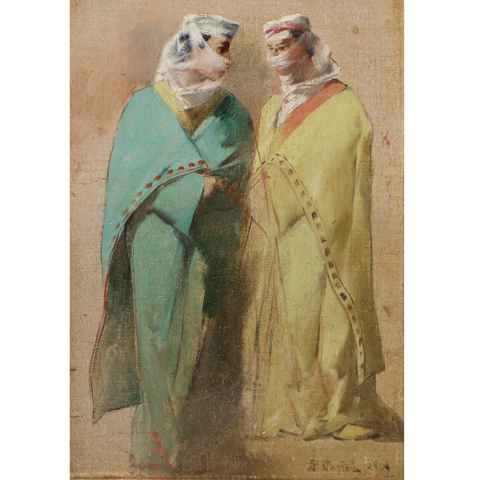 Alberto Pasini (Busseto (Parma) 1826-Torino 1899) - Donne in abiti orientali, 1869 Cm 21 x 14, in cornice Cm 39 x 34 Olio su tela Firmato e datato in basso a destra, sul retro timbro della galleria Fogliato di Torino di Alberto Marini, opera autentica N°909