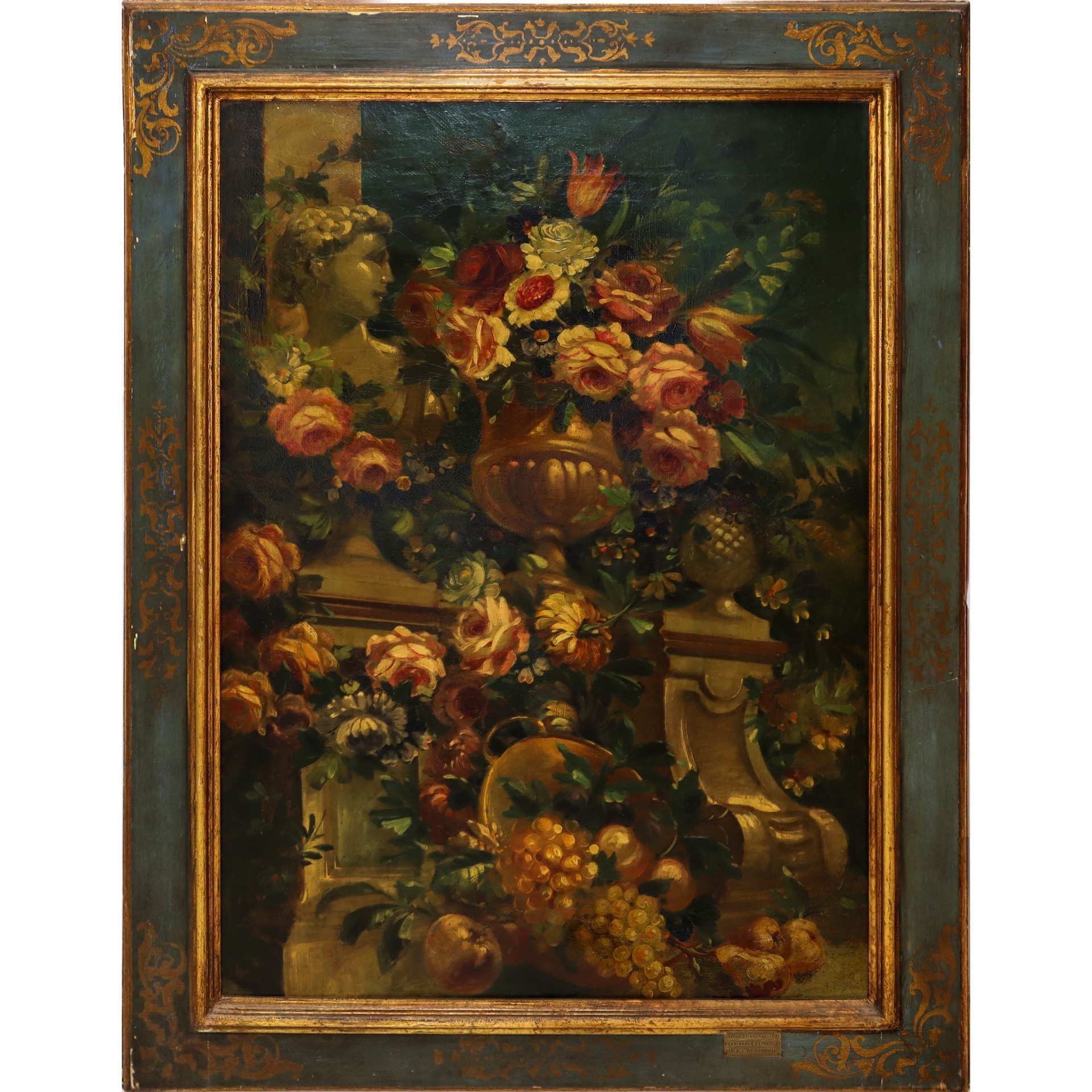Natura morta di fiori e statue, 19° secolo 96 x 65,5, in cornice 116 x 96 Olio su tela In bella cornice laccata