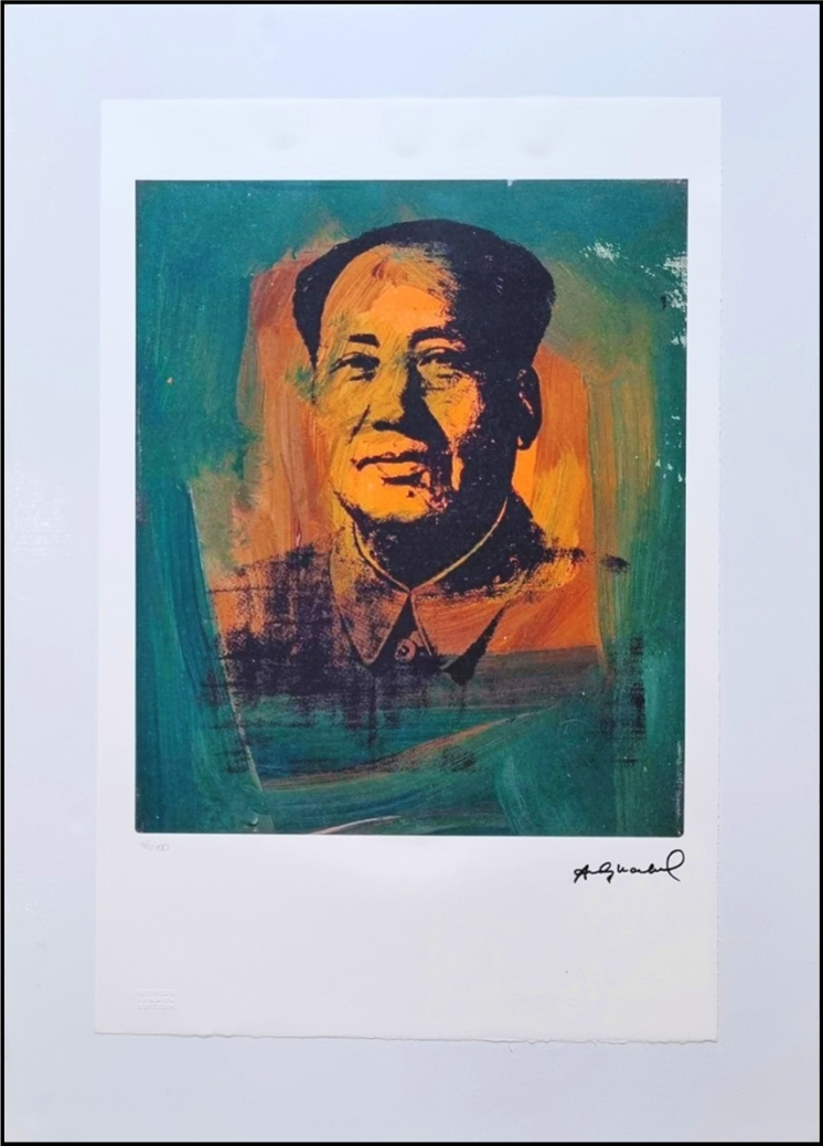 WARHOL ANDY Pittsburgh 1928 - New York 1987 "Mao Tse-tung" Litografia d'apres su carta Arches France cm 37x57. Firmata sul fronte in basso a destra, numerata 45/100 a matita a sinistra. Timbro a tampone editore, firma dell'artista in stampa. Sul retro timbro Leocastelli New York.