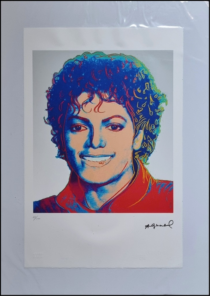 WARHOL ANDY Pittsburgh 1928 - New York 1987 "Michael Jackson" Litografia d'apres su carta Arches France cm 37x57. Firmata sul fronte in basso a destra, numerata 28/100 a matita a sinistra. Timbro a tampone editore, firma dell'artista in stampa. Sul retro timbro Leocastelli New York.