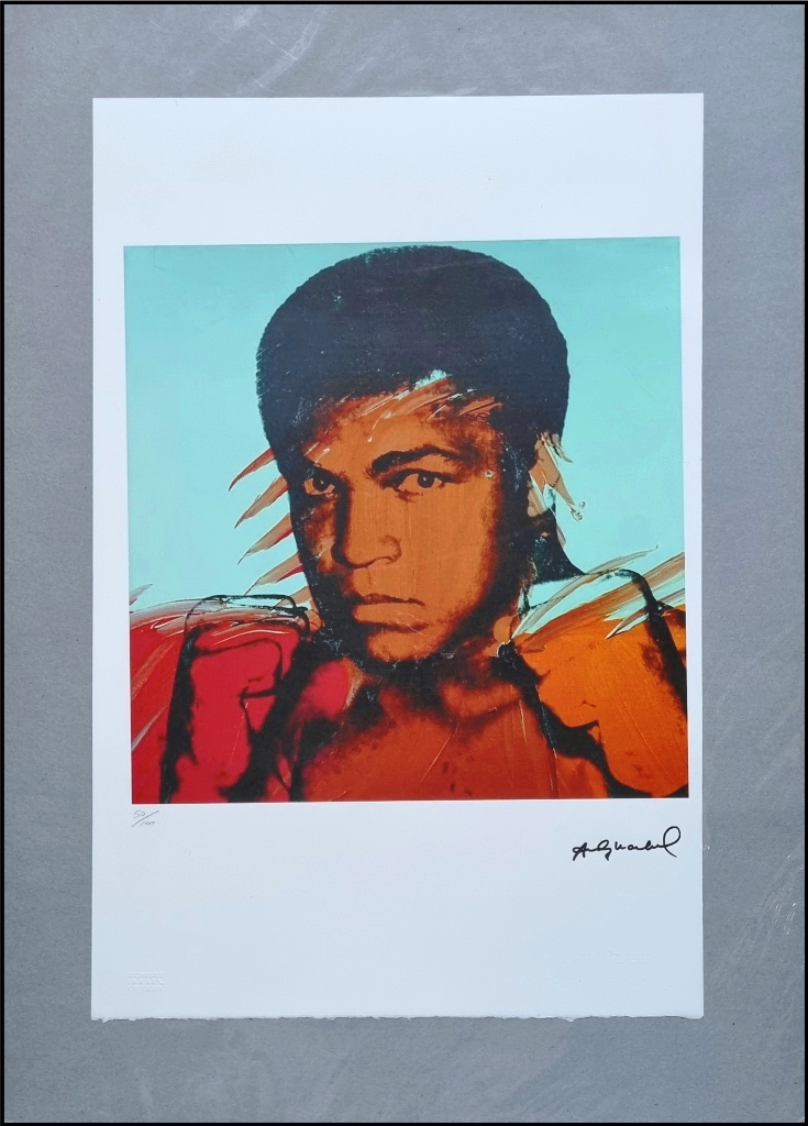 WARHOL ANDY Pittsburgh 1928 - New York 1987 "Muhammad Alì" Litografia d'apres su carta Arches France cm 37x57. Firmata sul fronte in basso a destra, numerata 50/100 a matita a sinistra. Timbro a tampone editore, firma dell'artista in stampa. Sul retro timbro Leocastelli New York.