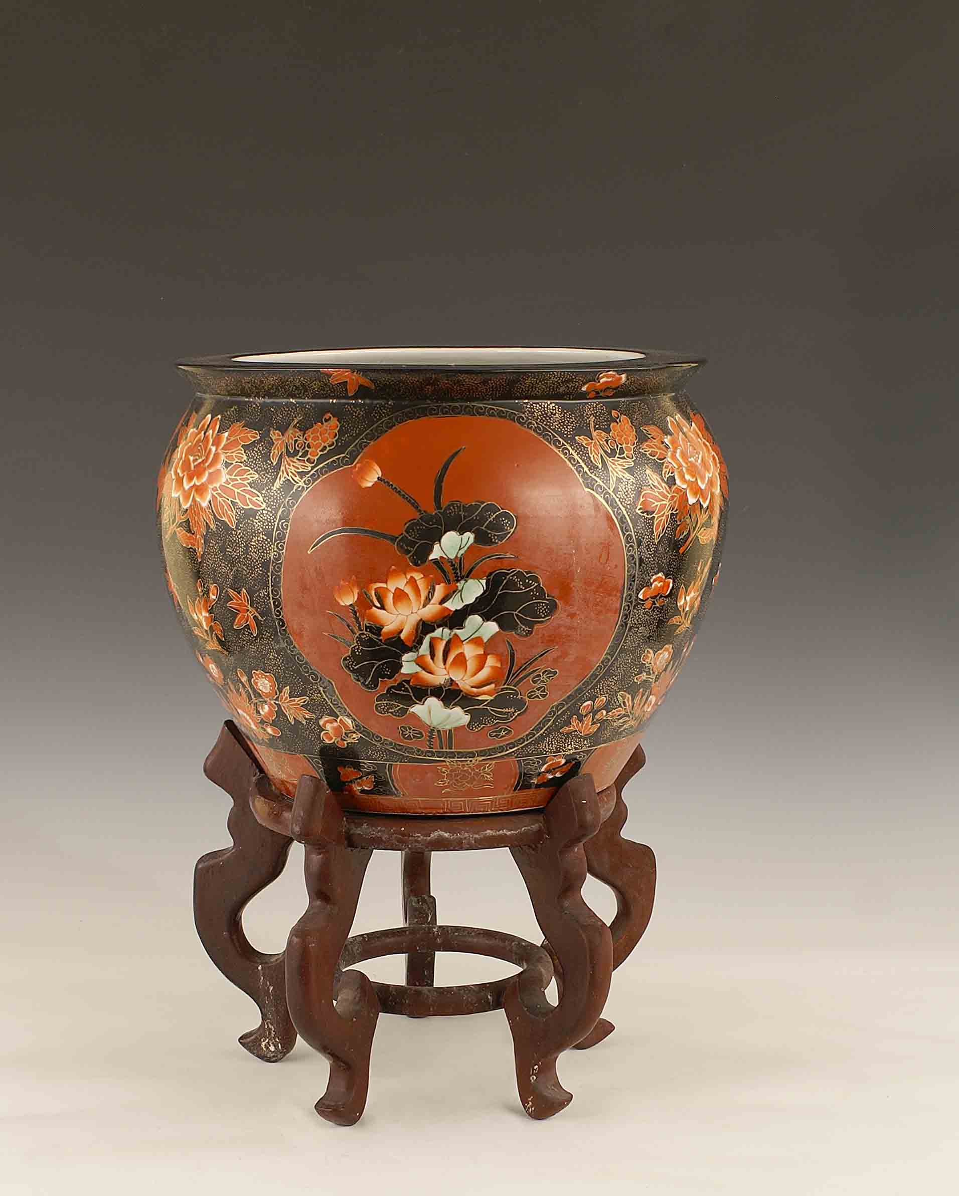 Cachepot in porcellana dipinta a policromia a motivo floreale, poggiante su base in legno, manifattura orientale, h. cm. 44, d. cm. 35.