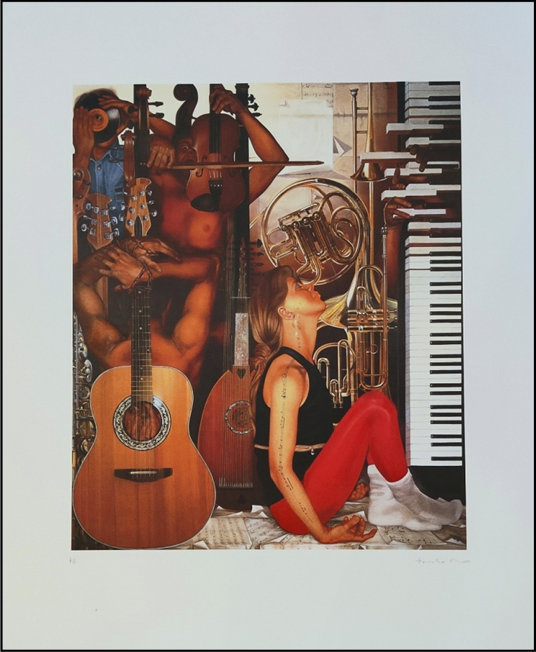 BRERO DOVILIO Torino 1950 "La musica" Litografia su cartoncino cm 70x84. Firmata sul fronte in basso a destra, esemplare P.A. a sinistra. Sul retro certificato di garanzia a cura dell'Istituto Grafico Italiano.