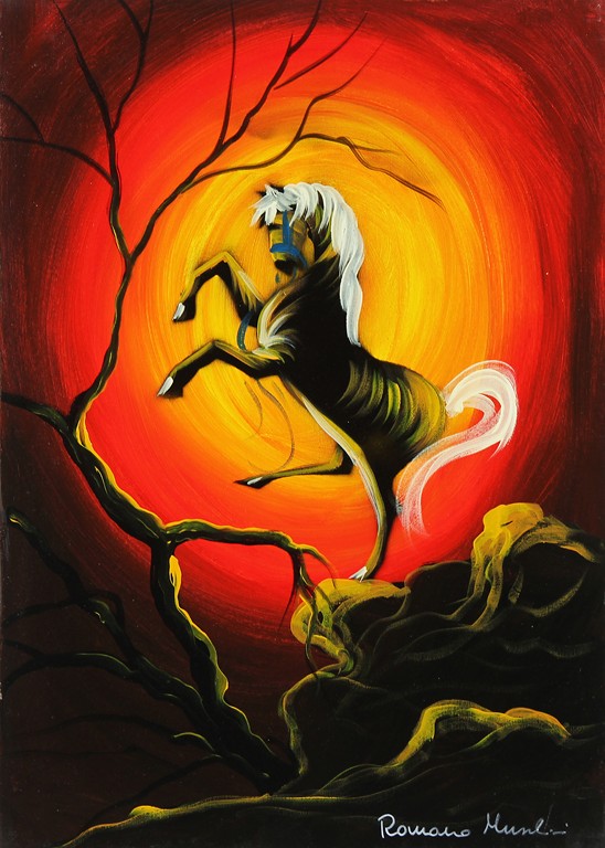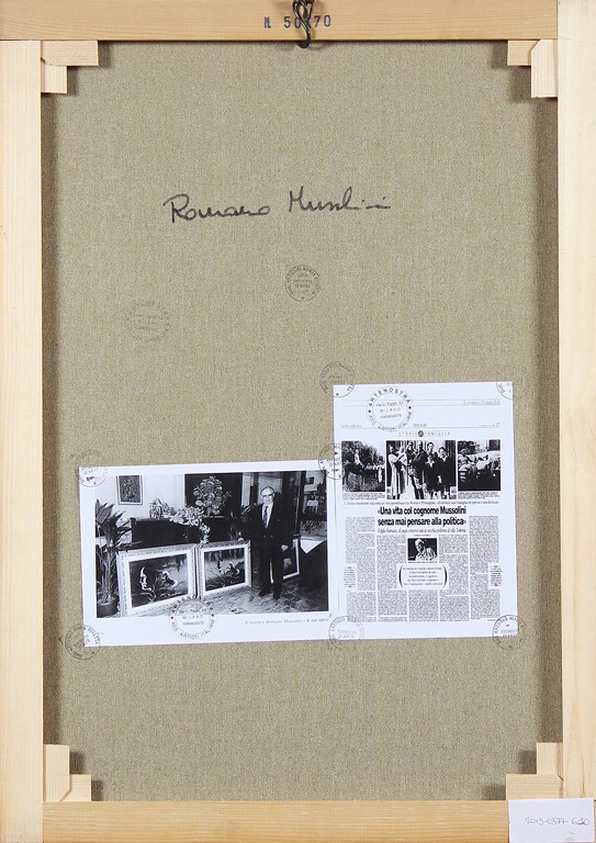 MUSSOLINI ROMANO (1927 - 2008) Senza titolo. Olio su tela . Cm 50,00 x 70,00. Firma in basso a destra. Al retro firma, timbro Artenostra Milano e Timbro Antonio Maria Pivetta storico dell' arte.