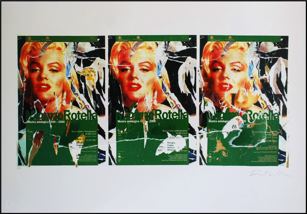 ROTELLA MIMMO Catanzaro 1918 - Milano 2006 "Omaggio a Marilyn" Multiplo, decollage e strappi di manifesto serigrafico su cartoncino pesante cm 100x70, del 2000-2009. Firmato sul fronte in basso a destra, tiratura P.A. Opera pubblicata sul catalogo "Mimmo Rotella Multiples decollage".