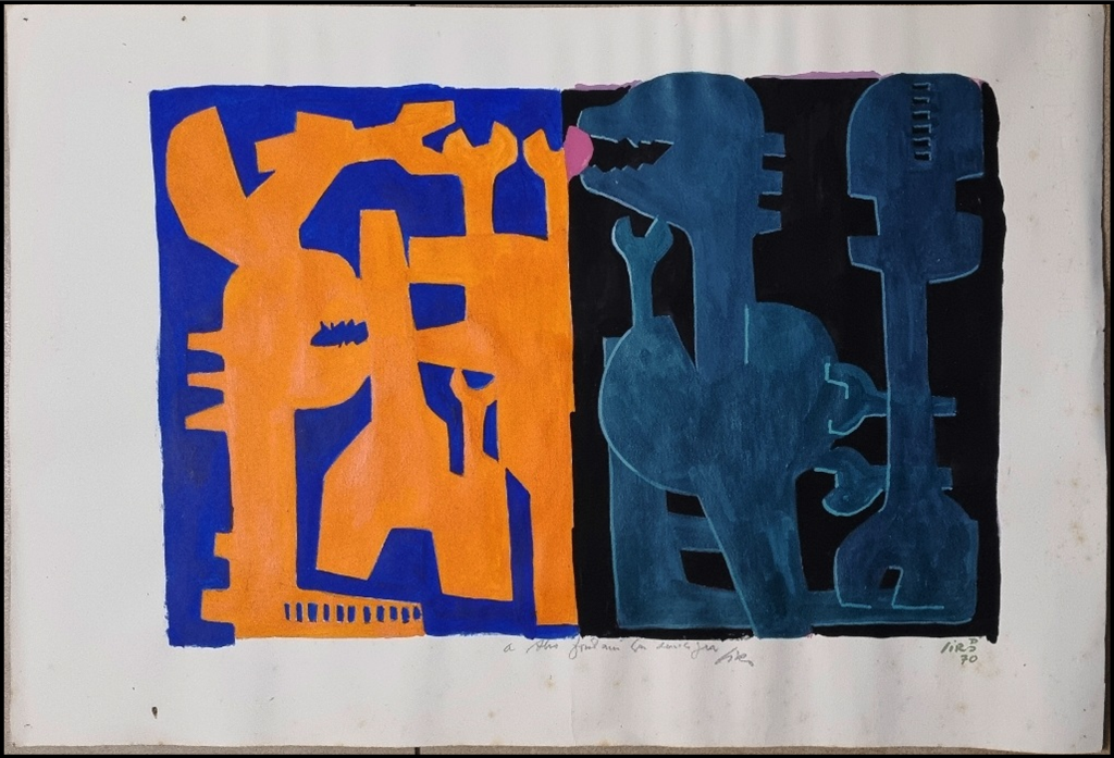 DI GIULIO SIRO Italia XX sec. "Senza titolo" Acrilico su cartoncino cm 56x38 del 1970. Firmato e datato sul fronte in basso a destra, dedicato al centro. (Presenta fioriture).