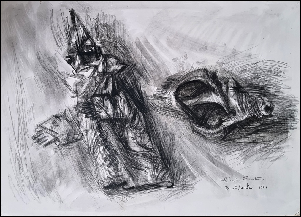 SANTINI RENATO Viareggio 1912 - 1995 "Senza titolo" Carboncino e matita su carta cm 70x50 del 1967. Firmato, dedicato e datato sul fronte in basso a destra.