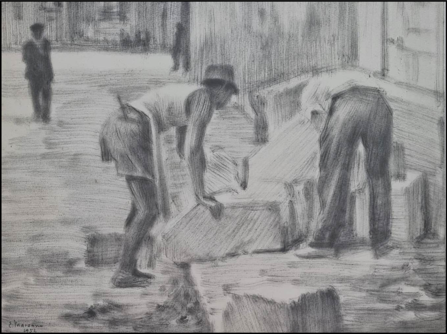 MARSANO ENNIO Lecce 1904 - Bari 1984 "Selciatori" Carboncino su carta cm 40x30 del 1952. Firmato e datato sul fronte in basso a sinistra, intitolato a destra.