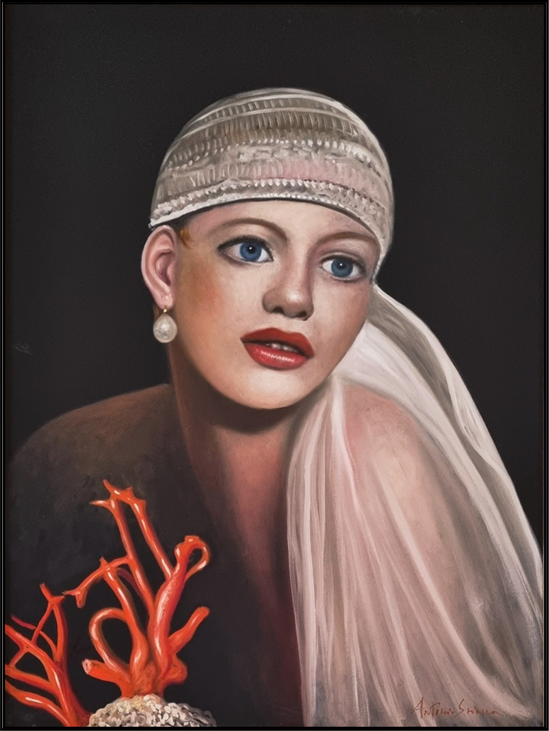 SCIACCA ANTONIO Catania 1957 "Figura femminile" Olio su tela cm 60x80. Firmato sul fronte in basso a destra. Sul retro titolo e firma. Autentica su foto a cura del maestro e foto dell'artista ritratto con l'opera.