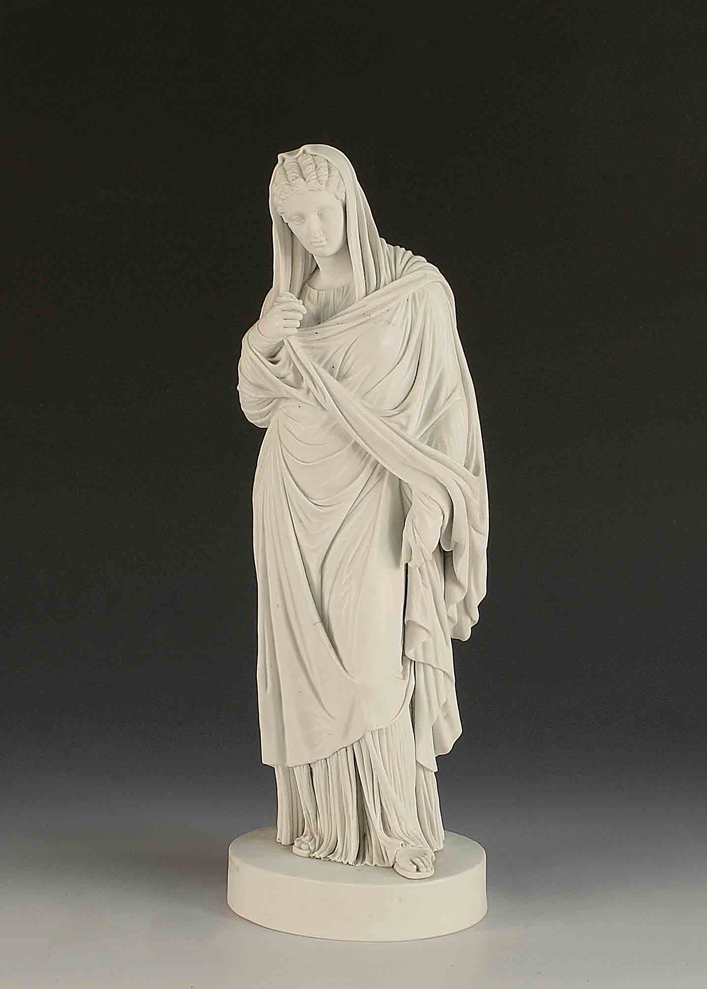 Gruppo in biscuit raffigurante una vestale poggiante su una base ovale, Meissen, h. cm. 35.