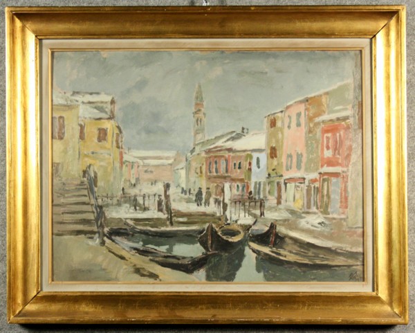 Firmato, datato. VELLANI MARCHI MARIO - Nato a Modena nel 1895. Morto a Milano nel 1979. Ha partecipato a diverse Biennali di Venezia e alla III Quadriennale romana. Sue opere sono custodite nelle Gallerie d'Arte Moderna di Roma, Milano e Palermo. Dipinto olio su cartone raff. ''NEVE A BURANO''. Firmato e datato 1945 in basso a destra. Reca sul retro il cartiglio della Galleria Ponte Rosso. Mis. Lung. cm. 68 Alt. cm. 50 ca.