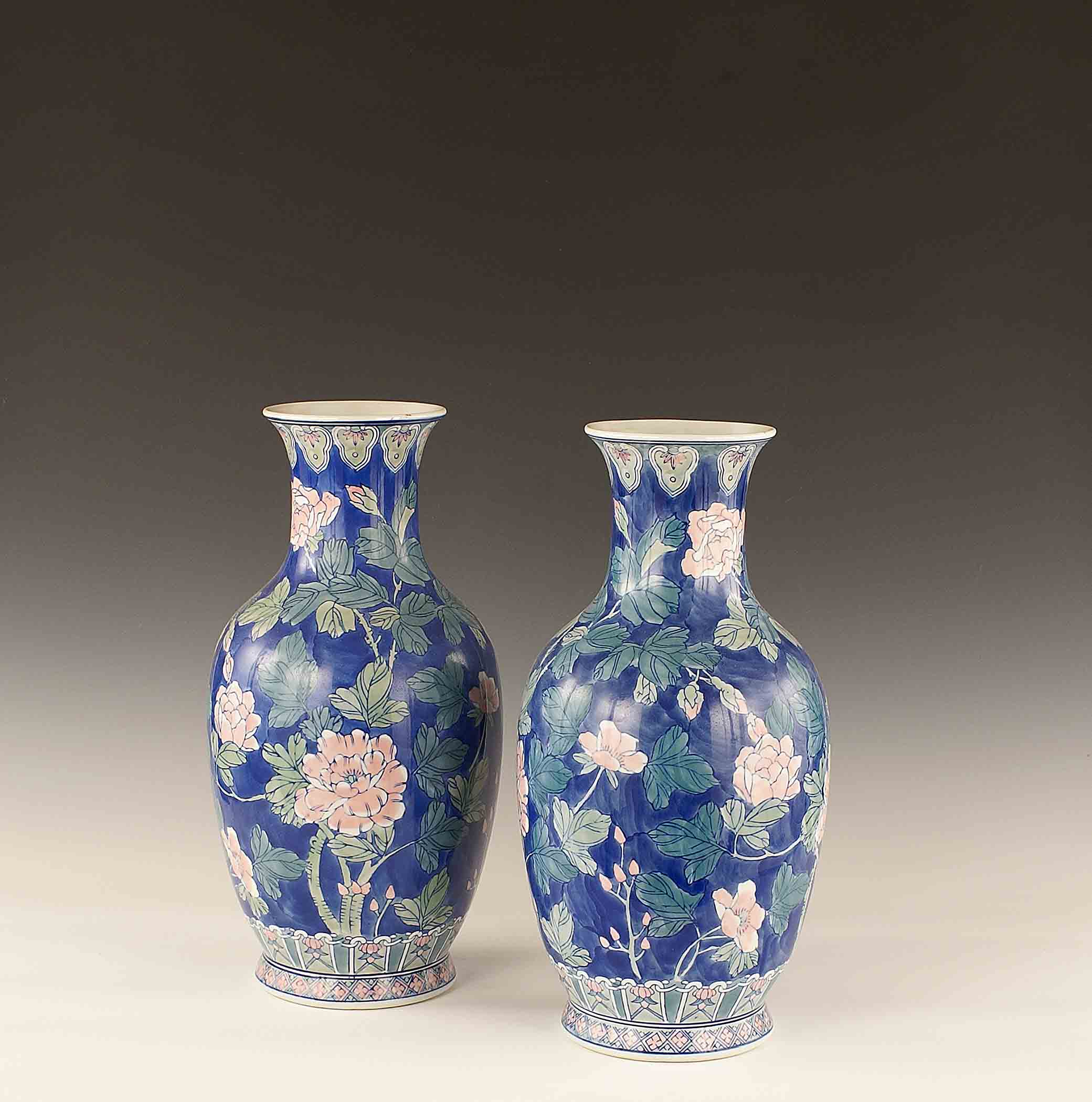 Coppia di vasi a balaustro in porcellana dipinta a policromia e decorata a motivo floreale, Cina, h. cm. 45.