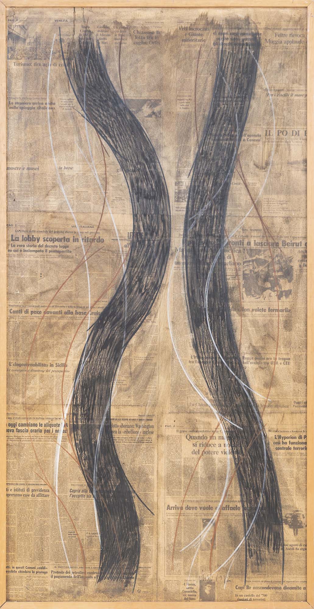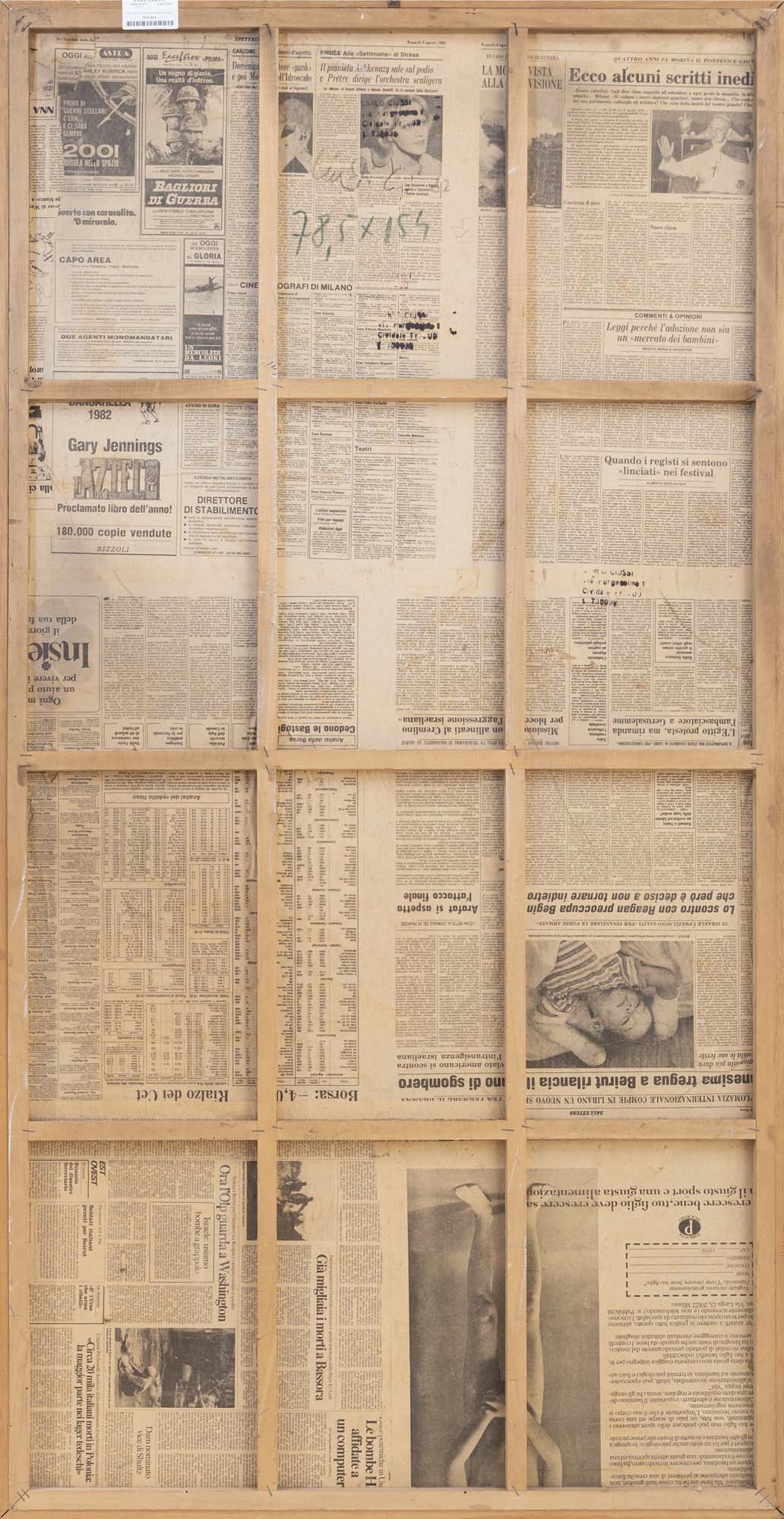 tecnica mista su carta da giornale e collage riportato su tavola cm. 154x78,5