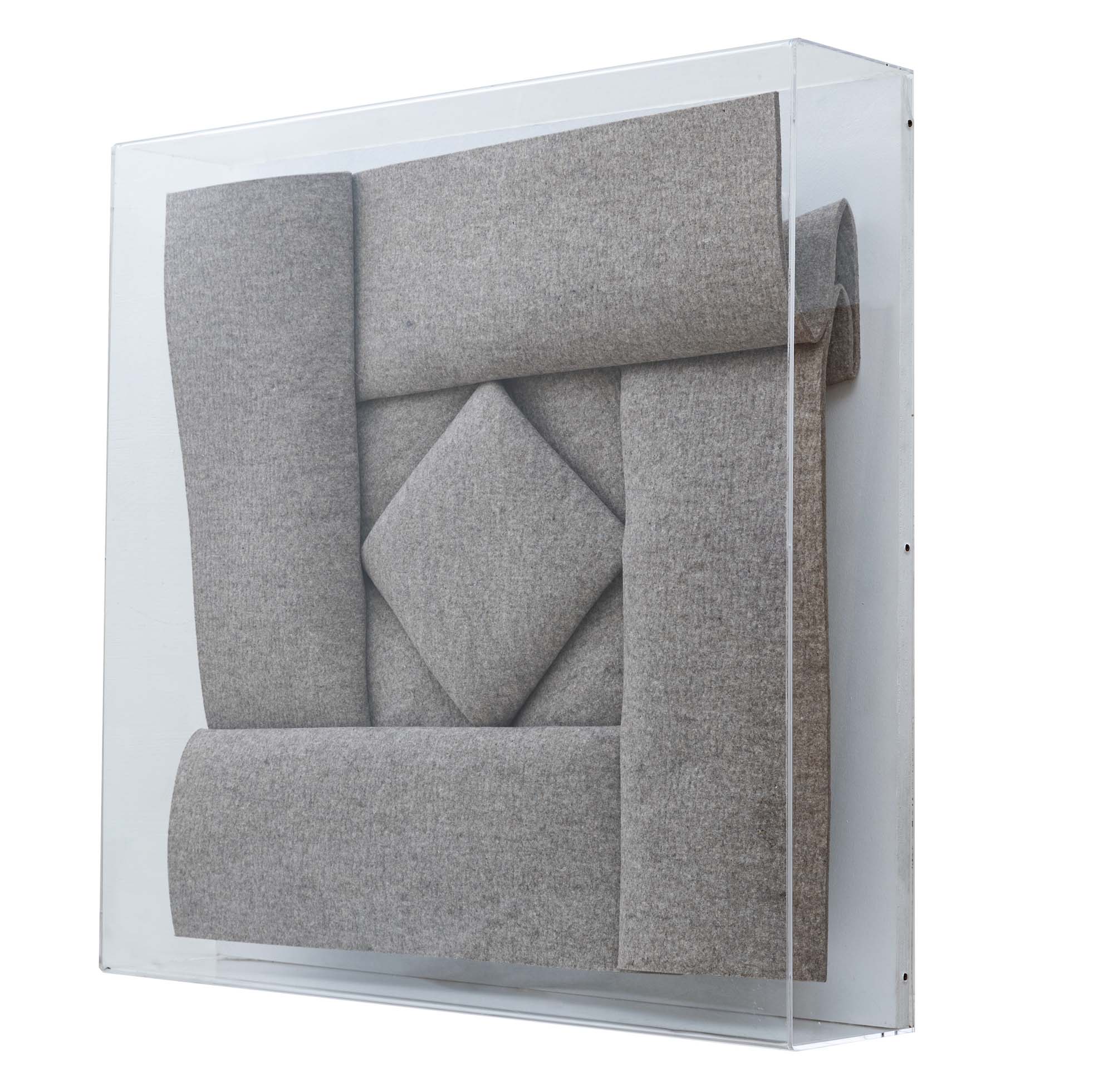 feltro sagomato riportato su tavola entro teca in plexiglass cm. 71x71x17