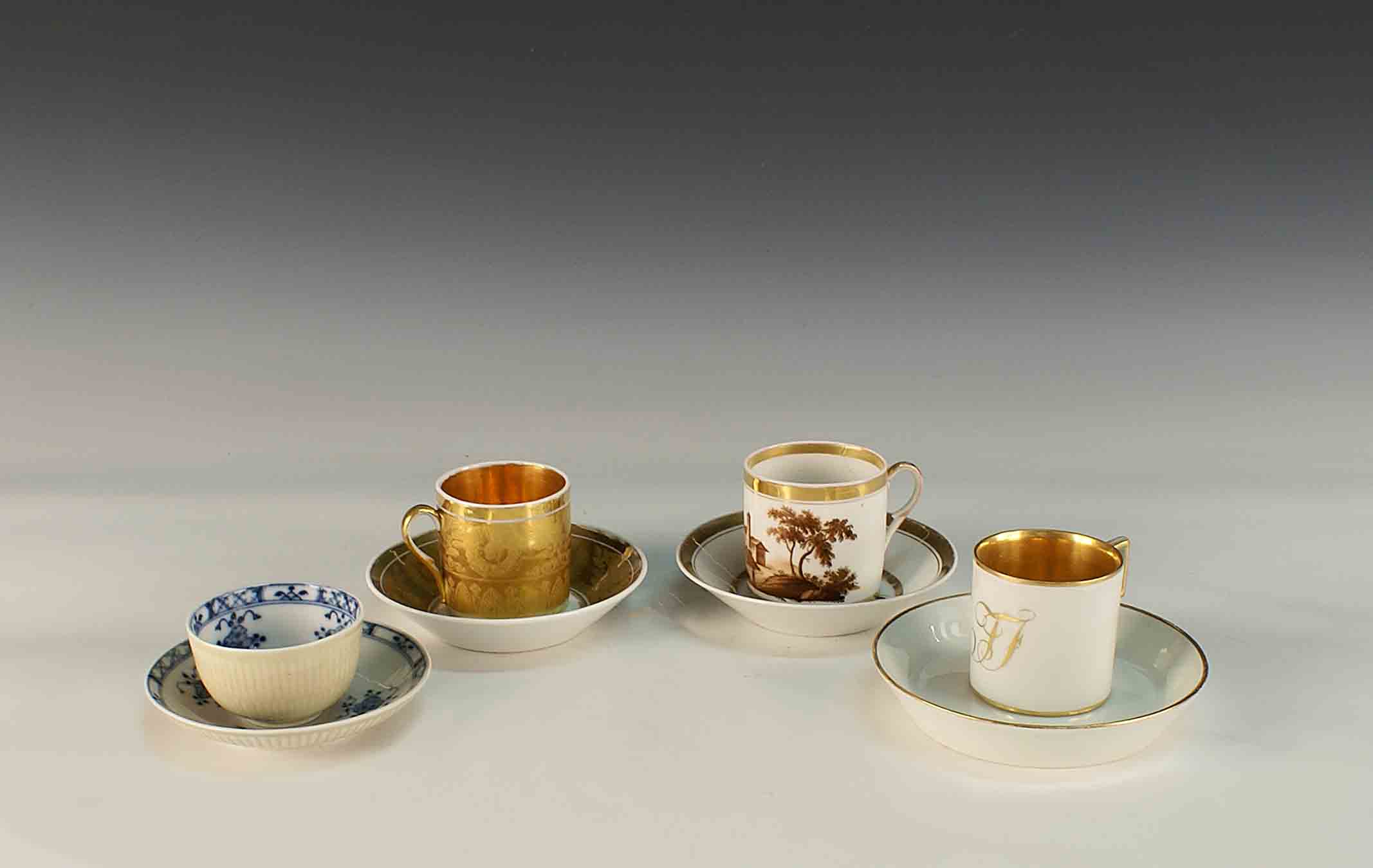 Lotto composto da quattro tazze con relativi piattini in porcellana dipinta a policromia, inizi del XX secolo, manifatture e fogge diverse.