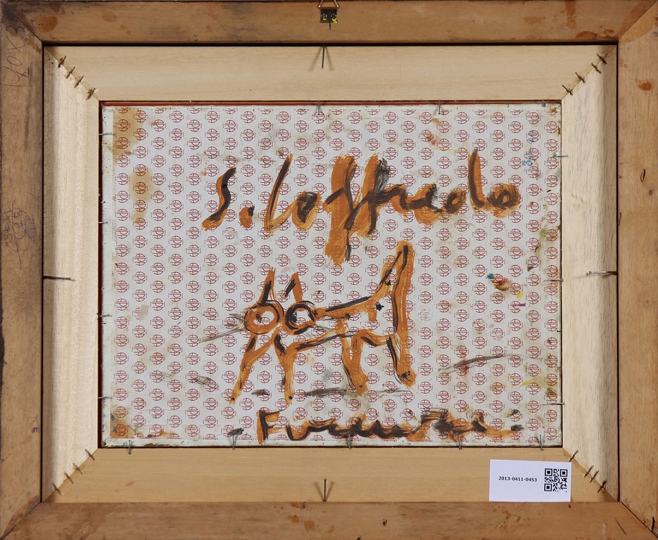 LOFFREDO SILVIO (n. 1921) Gatto. Tecnica mista su cartone telato. Cm 40,00 x 30,00. Firma in alto e al retro. Autentica dell' artista su fotografia. Cornice presente