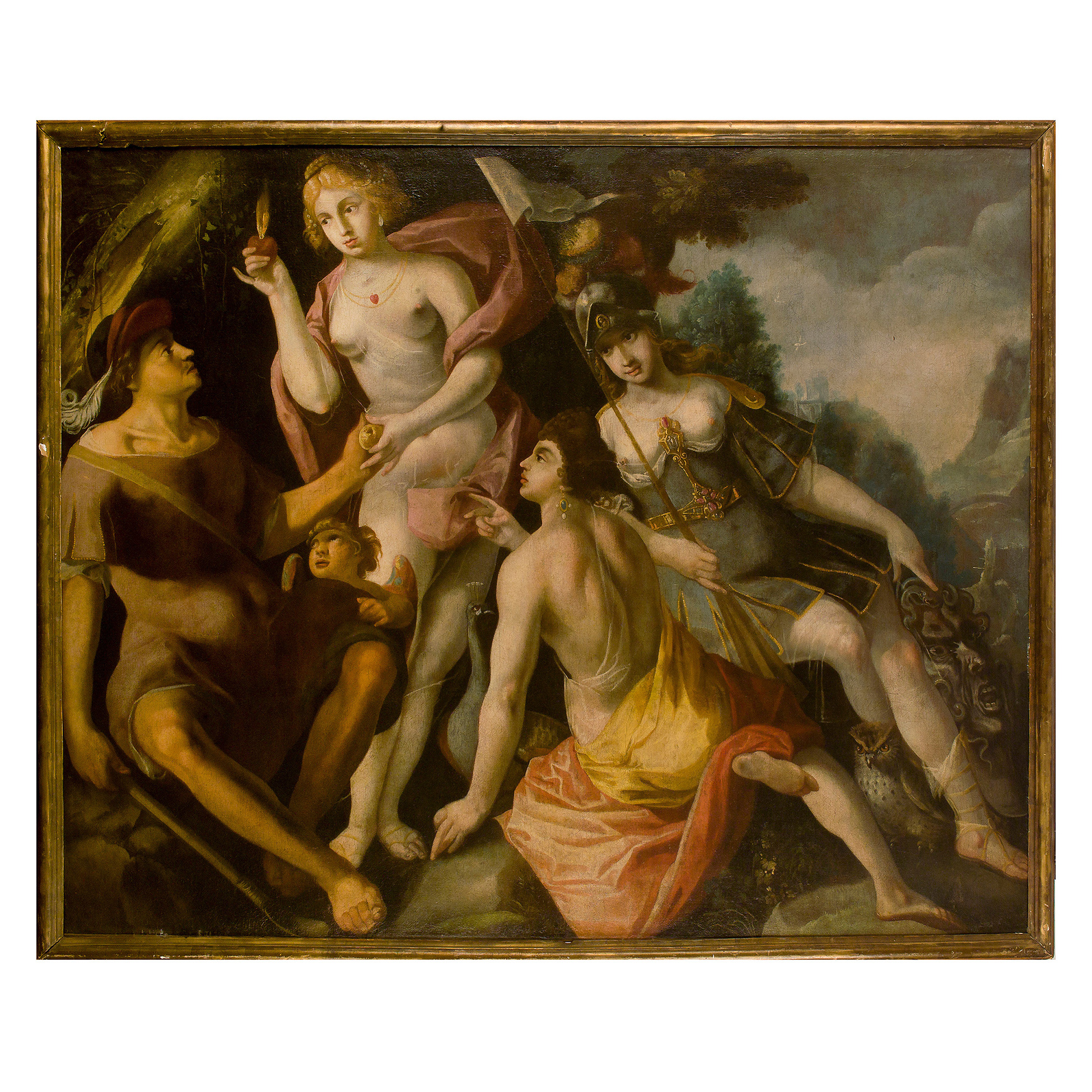 Il soggetto mitologico è ben riconoscibile nella sua ampia composizione di figure in conversazione tra loro. Paride è in procinto di consegnare la mela d'oro alla dea Venere, che in cambio del titolo della 'dea più bella' gli avrebbe riservato in dono l'amore della donna più bella del mondo. Presenziano alla scena le due dee rivali, Atena ed Era - accompagnate dai loro attributi - e il giovane Cupido che guarda intensamente l'eroe, quasi come a presagire il burrascoso destino che colpirà Paride ed Elena durante la Guerra di Troia.. Olio su tela, dimensioni ext. 207,5x169, int. 198x158 cm.