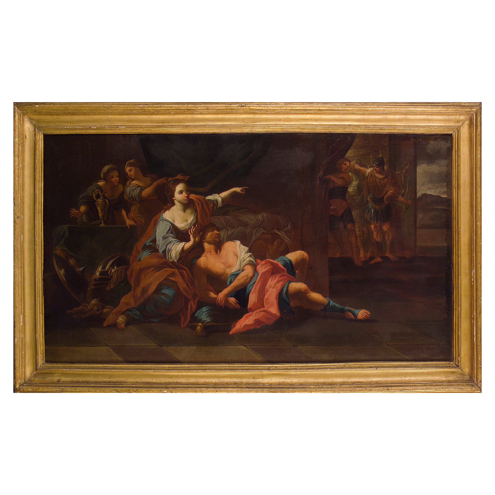 Questo dipinto, che al 1981 si presentava alla perizia di Maurizio Marini come in pendant con un altro episodio biblico, Giaele e Sisara, è attribuito dallo studioso al pittore napoletano Sebastiano Conca. Grande allievo del Solimena, la sua fedeltà alla lezione del maestro napoletano è qui riscontrabile negli sfondi e negli accessori dei personaggi. Il Conca qui si riconosce come eccellente interpreta della lezione dell'accademismo del suo maestro, fusa con il raffinato classicismo del Maratta.. Olio su tela, dimensioni ext. 94x155, int. 74,5x136 cm.