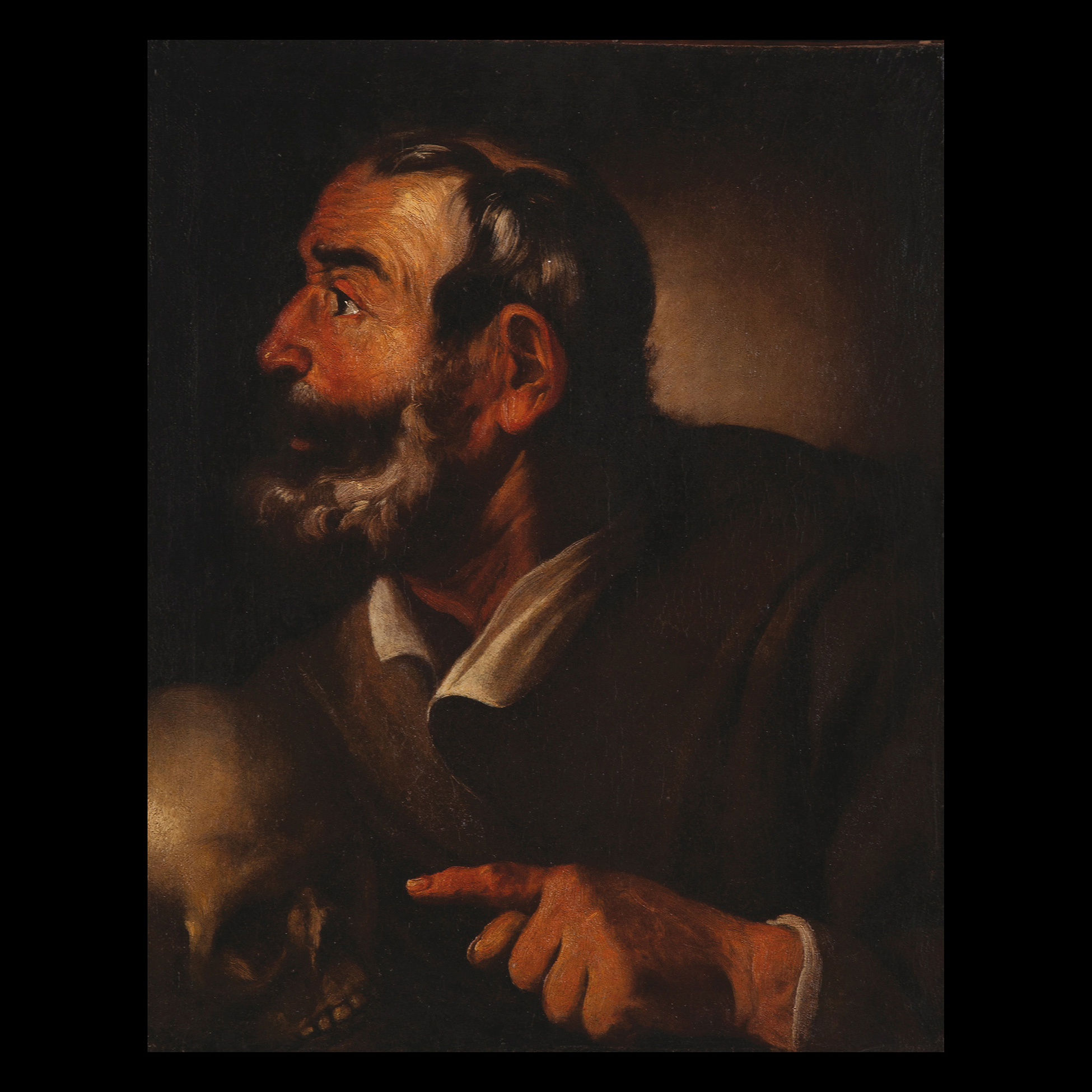 Francesco Fracanzano si trasferisce molto presto a Napoli, per entrare nella bottega di uno dei pittori più rinomati del momento: Jusepe de Ribera. Inizialmente il pittore aderisce allo stile pastoso e cromaticamente violento del suo maestro, ma nella sua fase più matura se ne discosta gradualmente, per abbracciare una lettura più classicistica degli elementi compositivi e una sempre più convinta adesione alle proposte fiamminghe; ma vera dote del pittore è di certo la capacità di legare queste esperienze tra loro, sintetizzandole in uno stile unico. Quest’opera di bottega raffigura un saggio anziano che sembra discorrere con qualcuno all’esterno della scena riguardo la fugacità dell’esistenza: sembra voler rammentare al suo interlocutore l’ineluttabilità della morte; non è da escludere la possibilità che in passato facesse parte di un pendant. Il taglio estremamente ravvicinato, l’espressività tutta protesa “fuori campo” dell’uomo lasciano presumere l’esistenza di un dipinto a lui corrispondente.. Olio su tela, cm 62x50