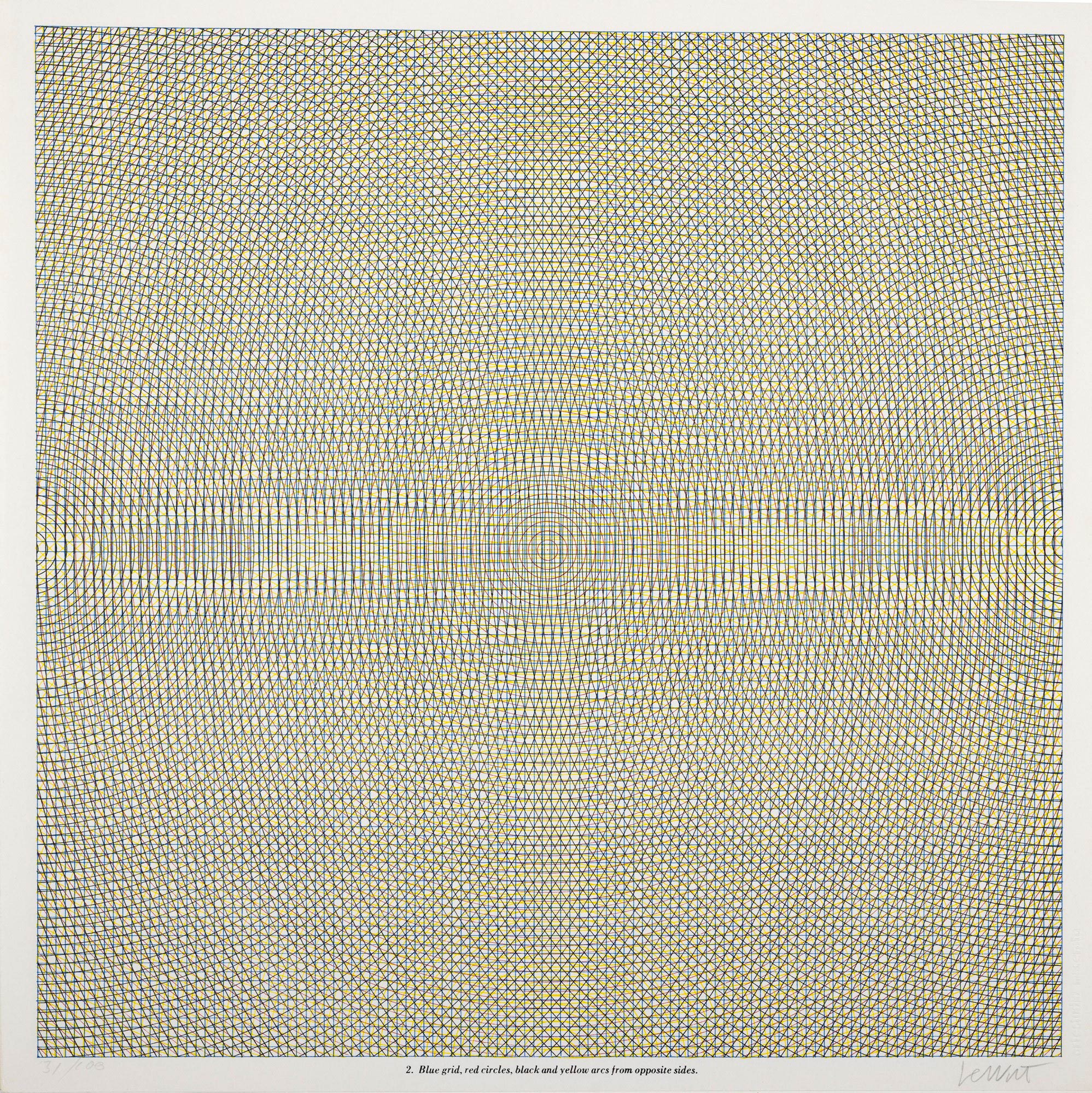 Sol LeWitt (Hartford 1928-New York 2007) - Blue grid, red circles, black and yellow arcs from opposite sides, 1972