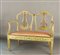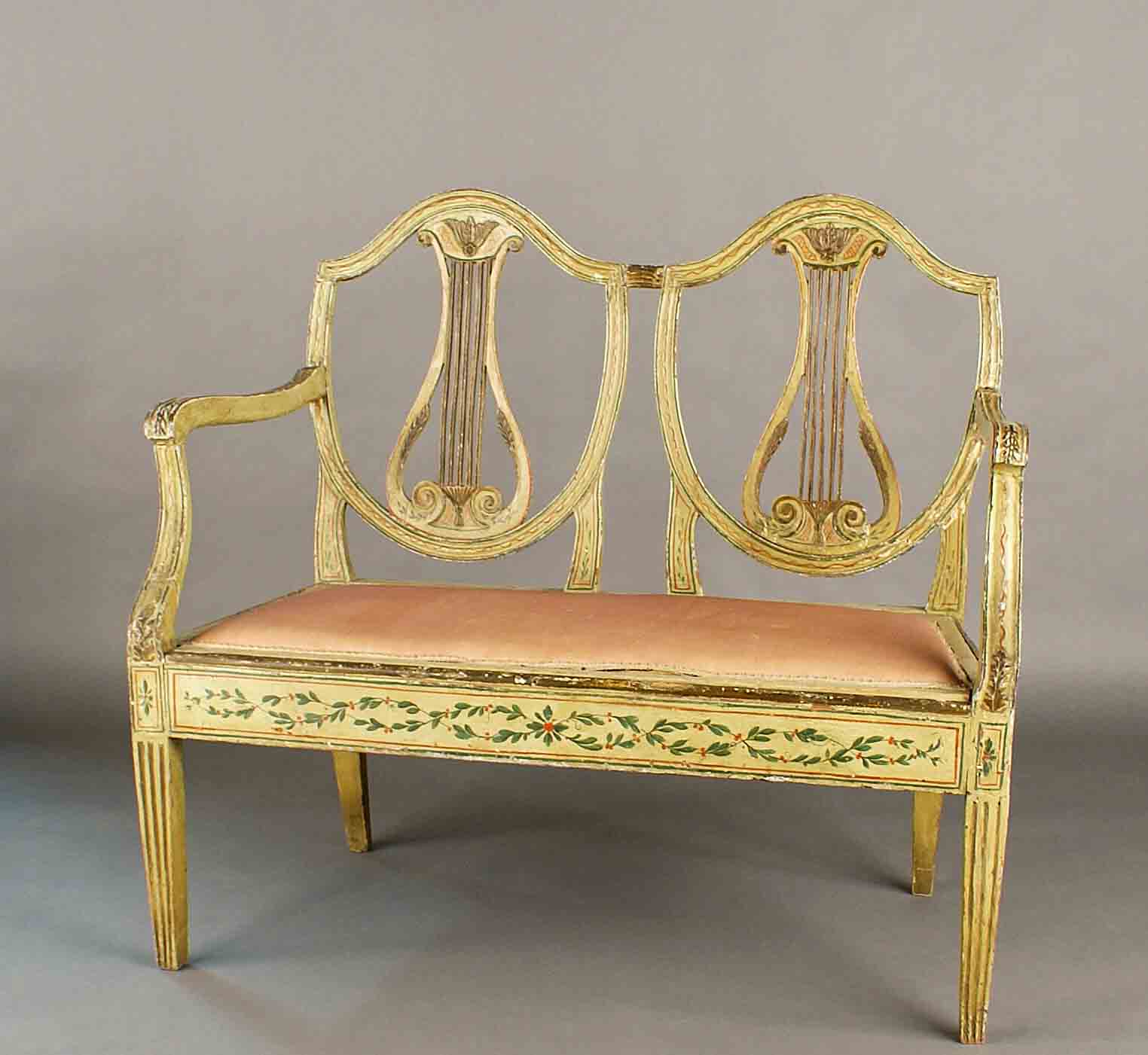 Divanetto a due posti in legno laccato ed intagliato, dipinto a policromia, schienale traforato e decorato a motivo di lira, seduta rivestita in tessuto, Italia centrale, periodo Luigi XVI, cm. 90x100x50.