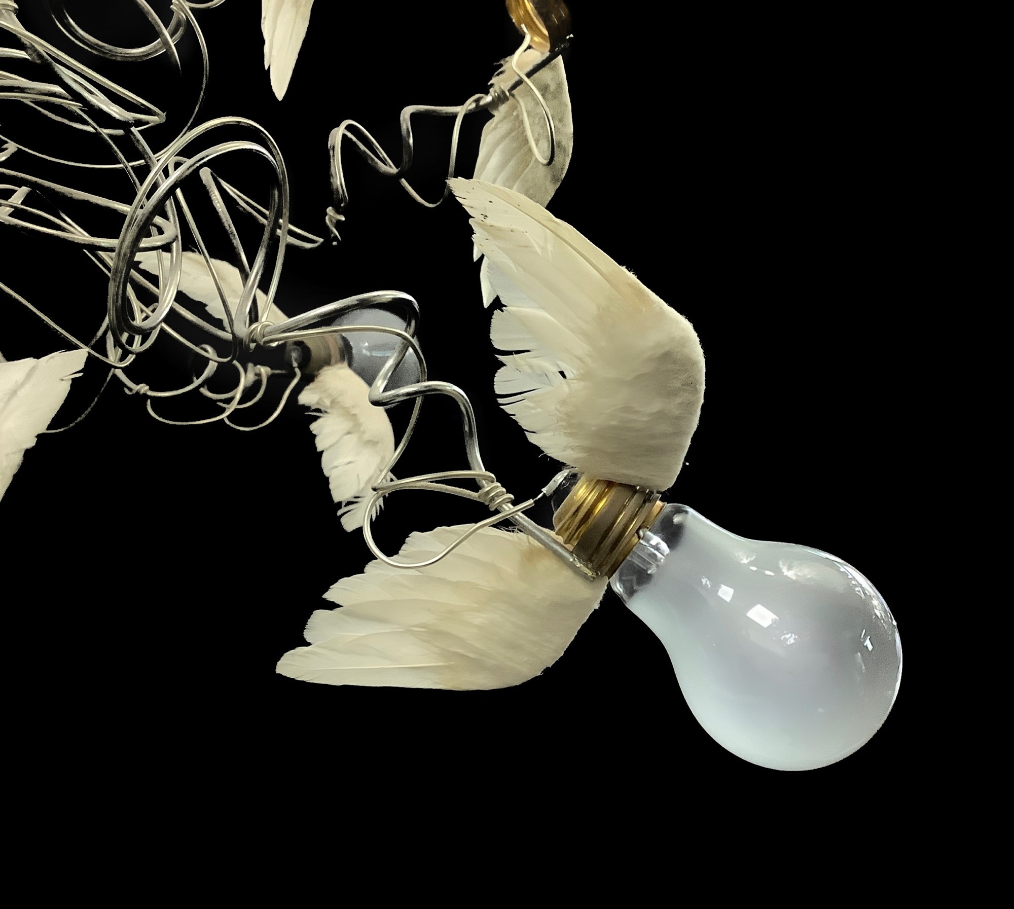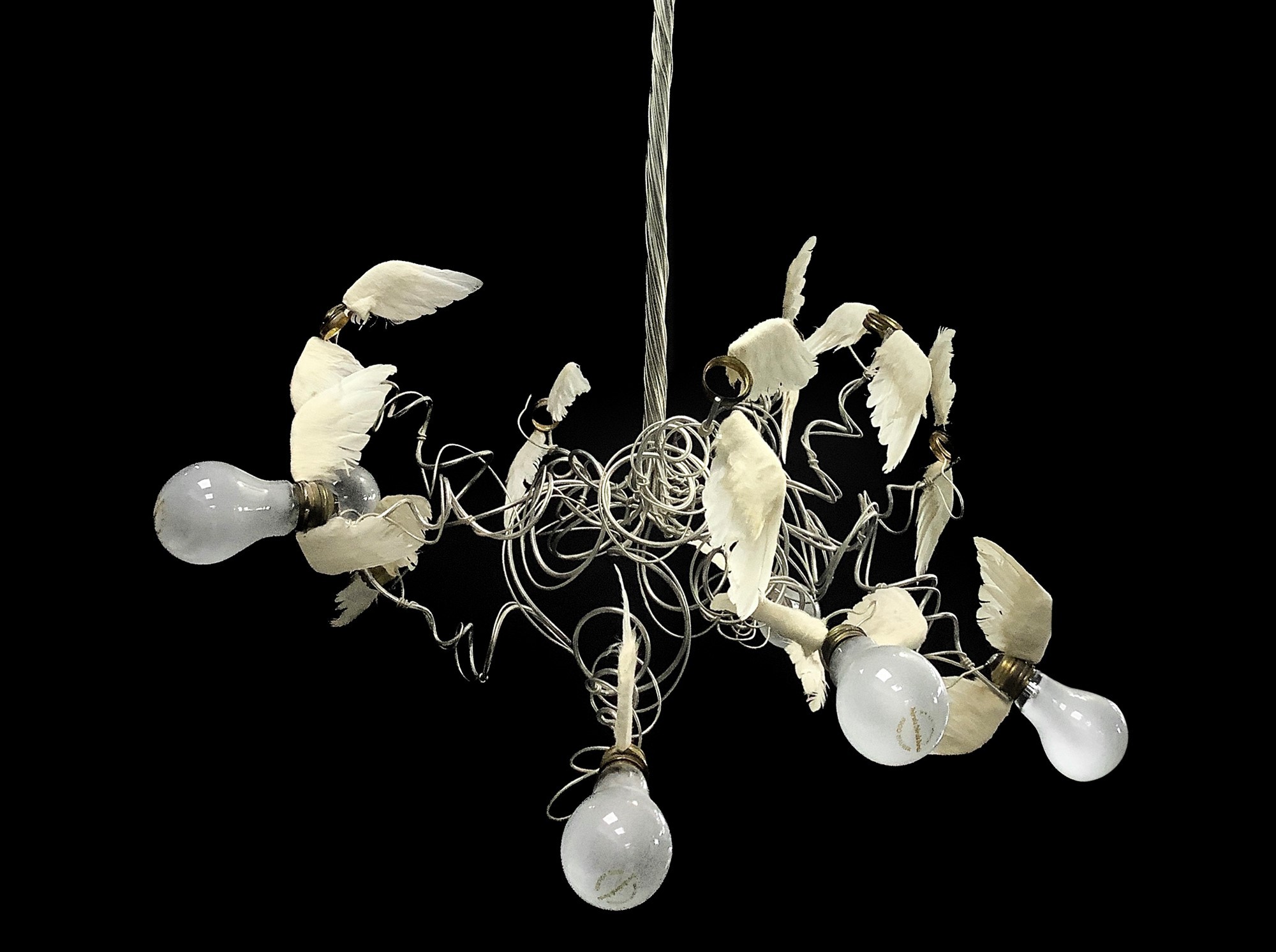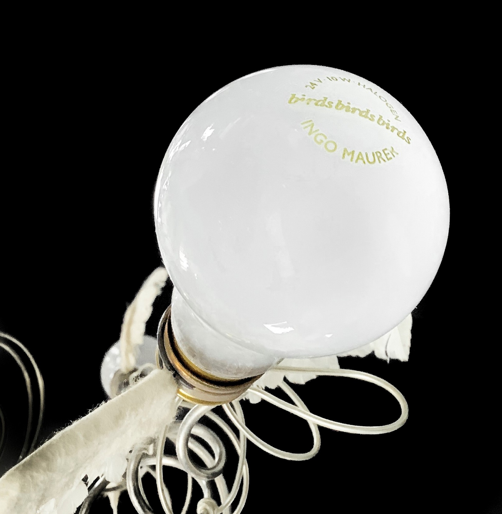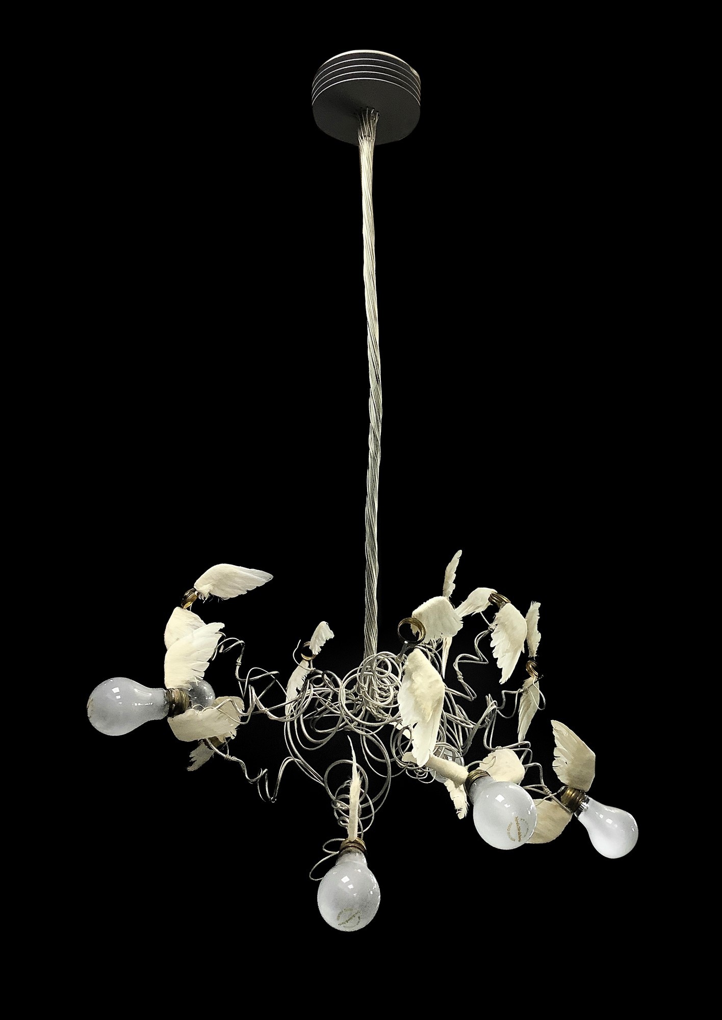 Ingo Maurer (1966) - Lampadario a sospensione a 12 luci modello Lucellino h cm 120, diametro cm 52 Produzione M. Maurer e disegno Ingo Maurer, struttura in metallo argentato e diffusori a guisa di volatile,alimentazione a 12V