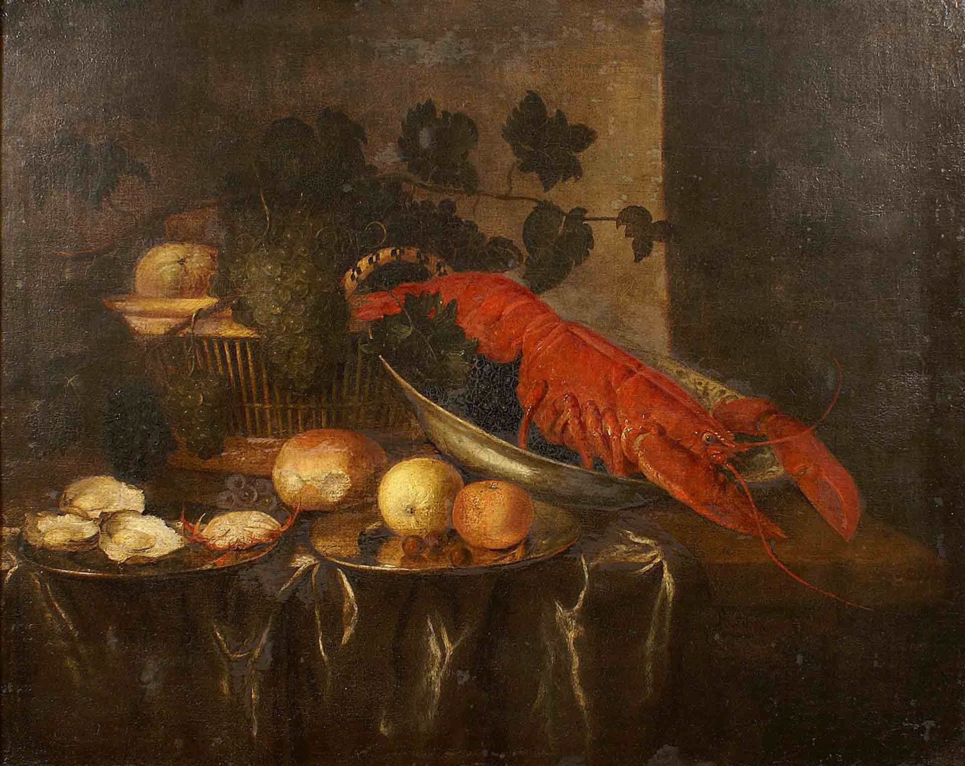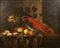 Scuola fiamminga del XIX secolo, "Natura morta con cesto di frutta e crostacei", olio su tela, cm. 77x97, siglato in basso a destra.