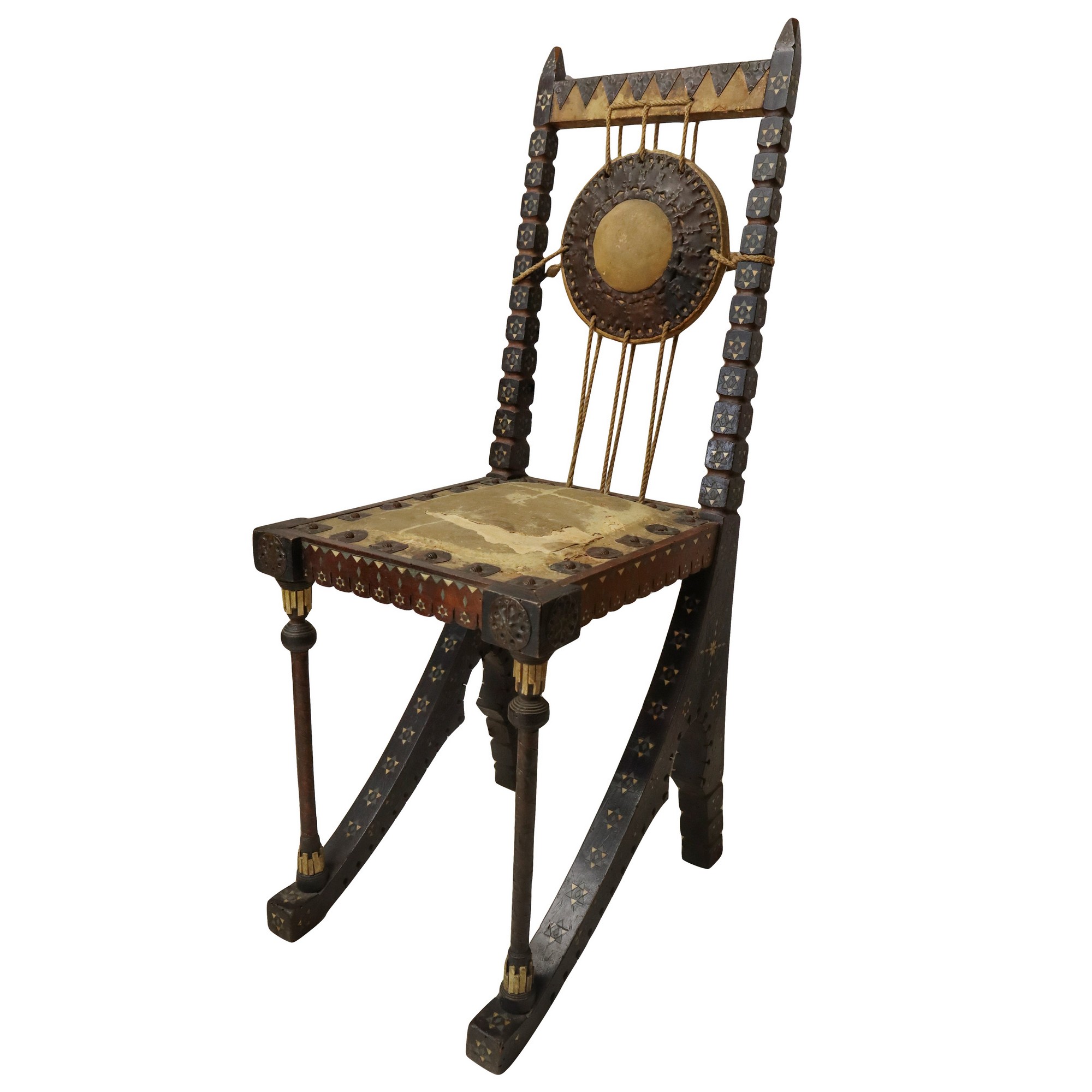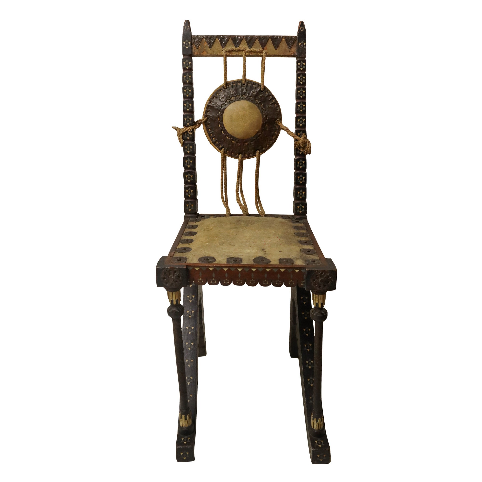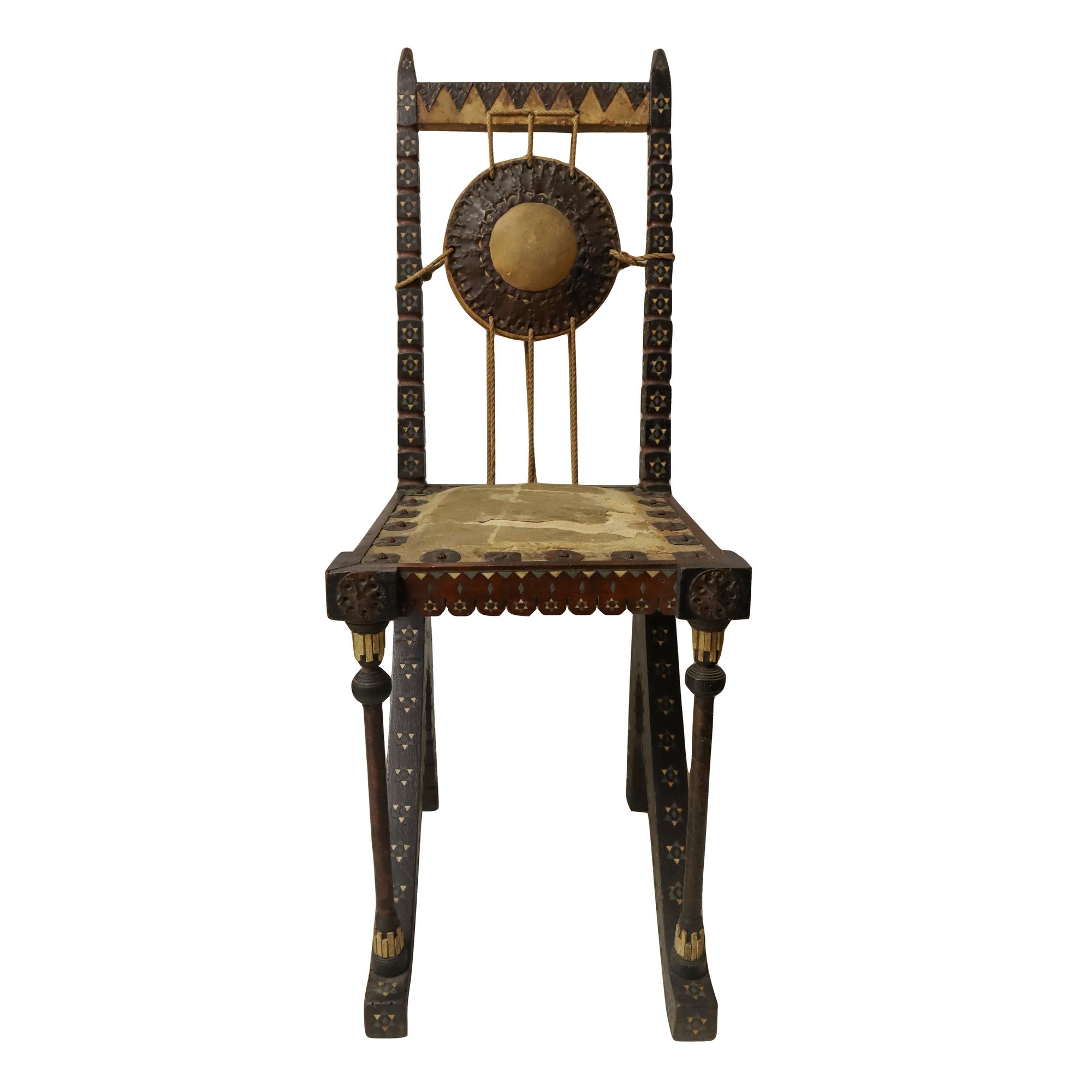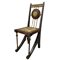 Carlo Bugatti - Rarissima coppia di sedie, in legno di noce tinto ebano, lavorato e tornito, decorazioni in rame sbalzato, intarsi in osso, seduta in cuoio. Mai restaurate. Segni del tempo sulla seduta in cuoio.