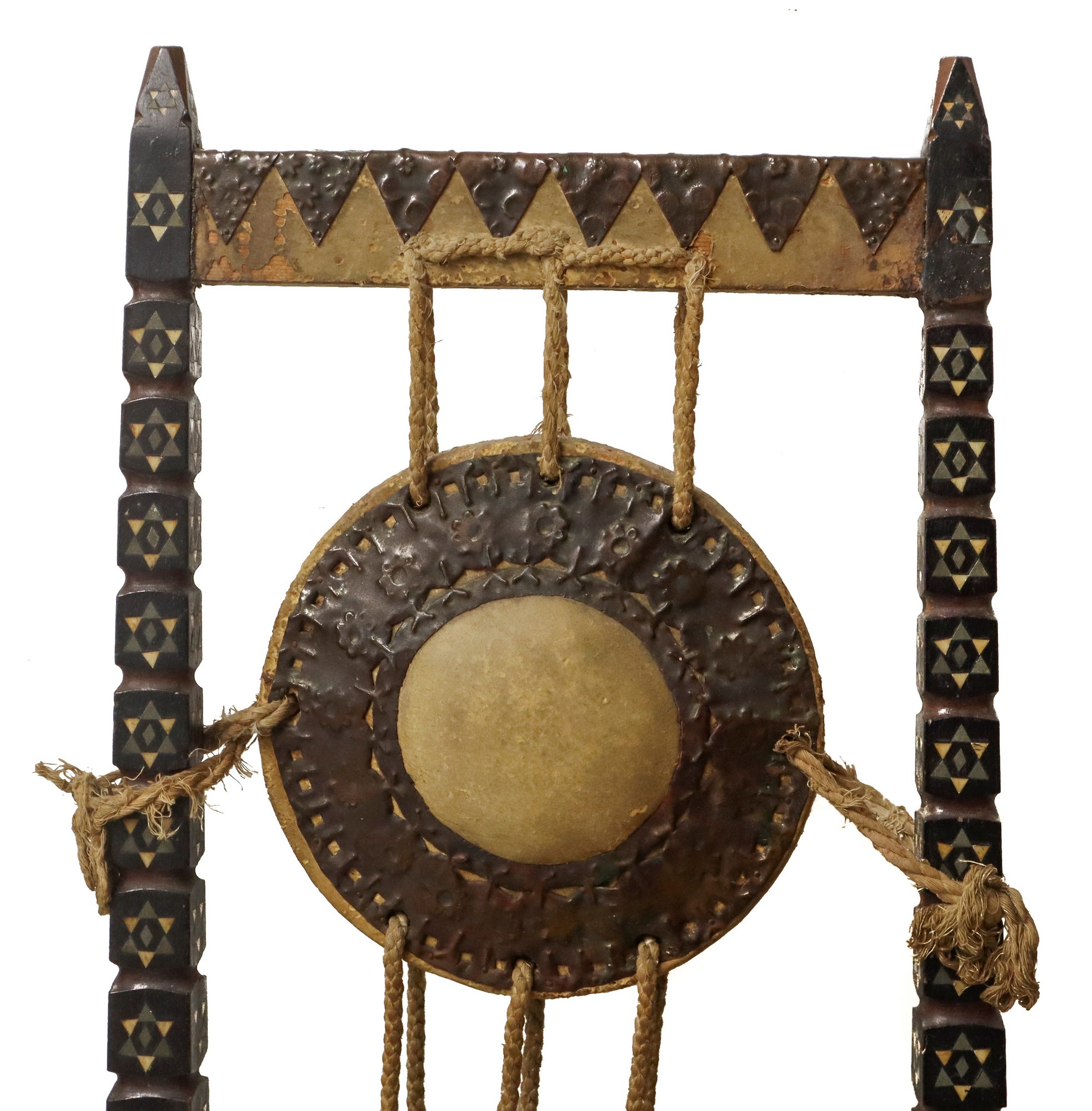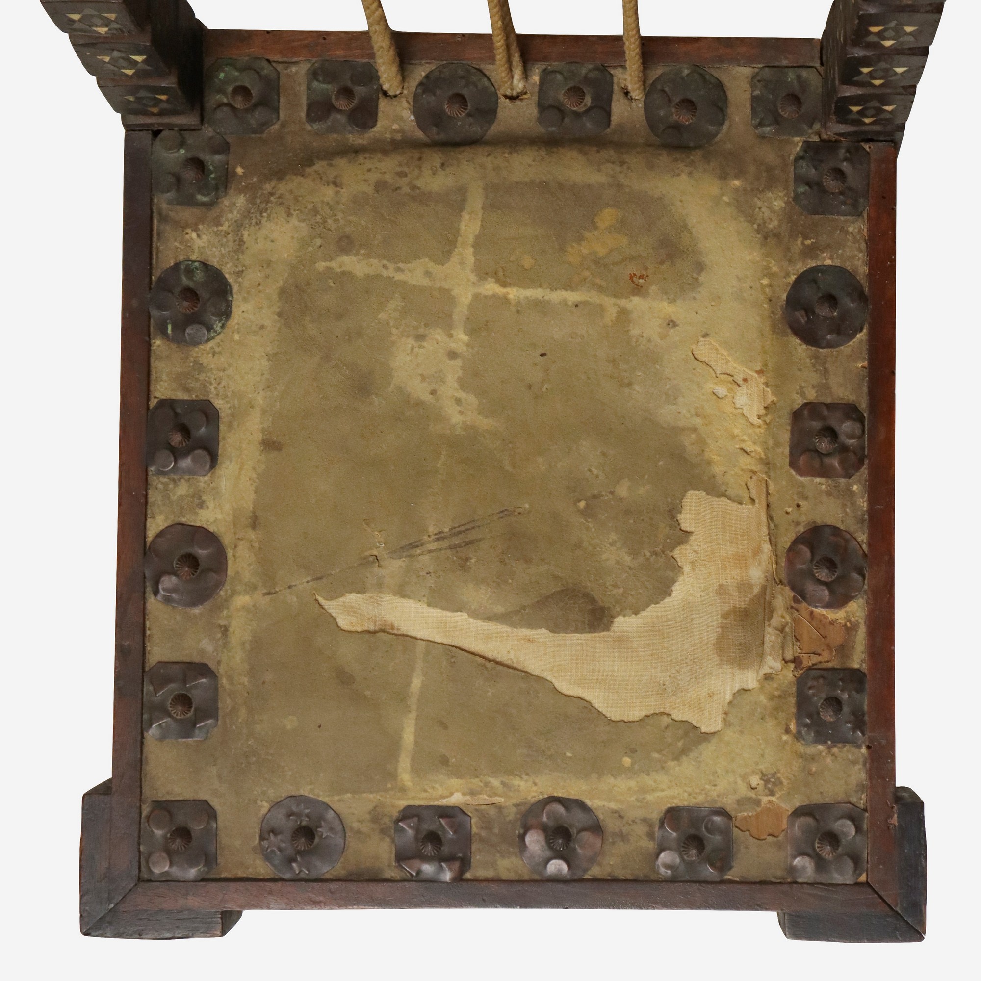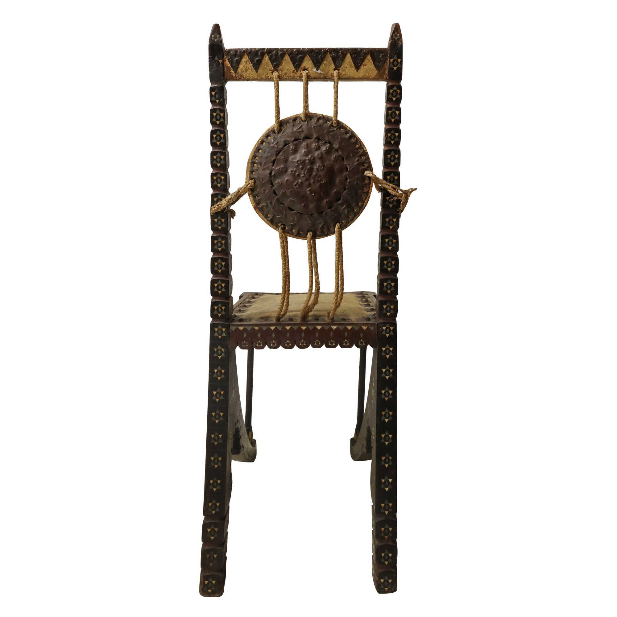 Carlo Bugatti - Rarissima coppia di sedie, in legno di noce tinto ebano, lavorato e tornito, decorazioni in rame sbalzato, intarsi in osso, seduta in cuoio. Mai restaurate. Segni del tempo sulla seduta in cuoio.