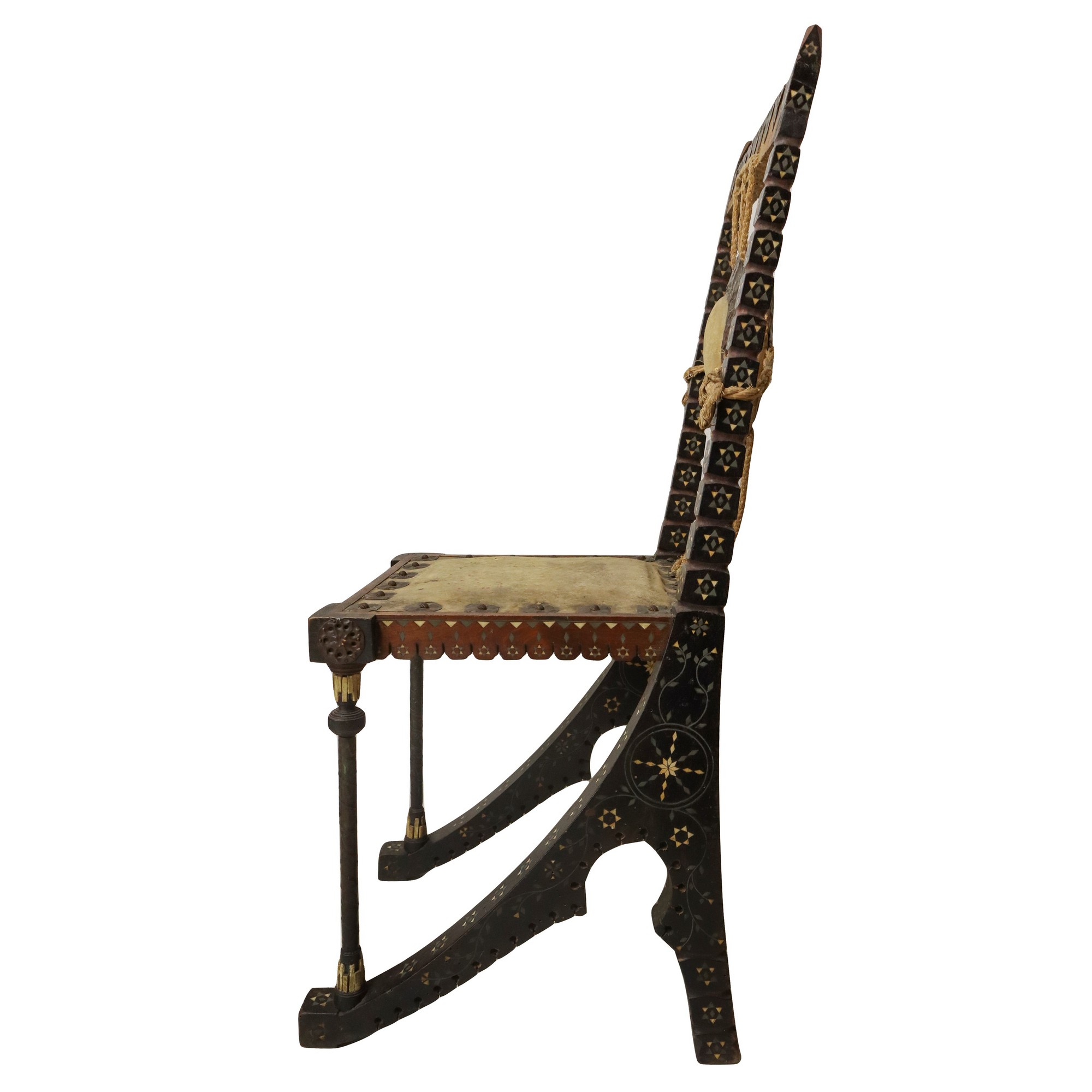 Carlo Bugatti - Rarissima coppia di sedie, in legno di noce tinto ebano, lavorato e tornito, decorazioni in rame sbalzato, intarsi in osso, seduta in cuoio.