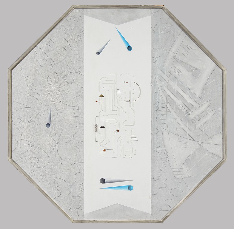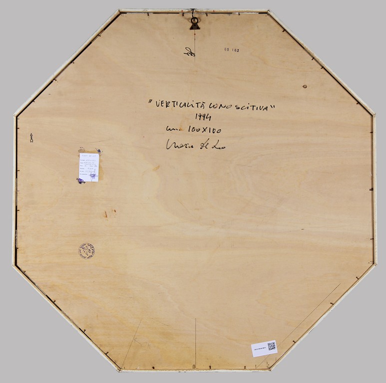 DE LEO MARIO (n. 1944) Verticalità conoscitiva. 1994. Tecnica mista su tavola. Cm 100,00 x 100,00. Al retro firma, data e cartiglio Galleria Transit. Cornice presente