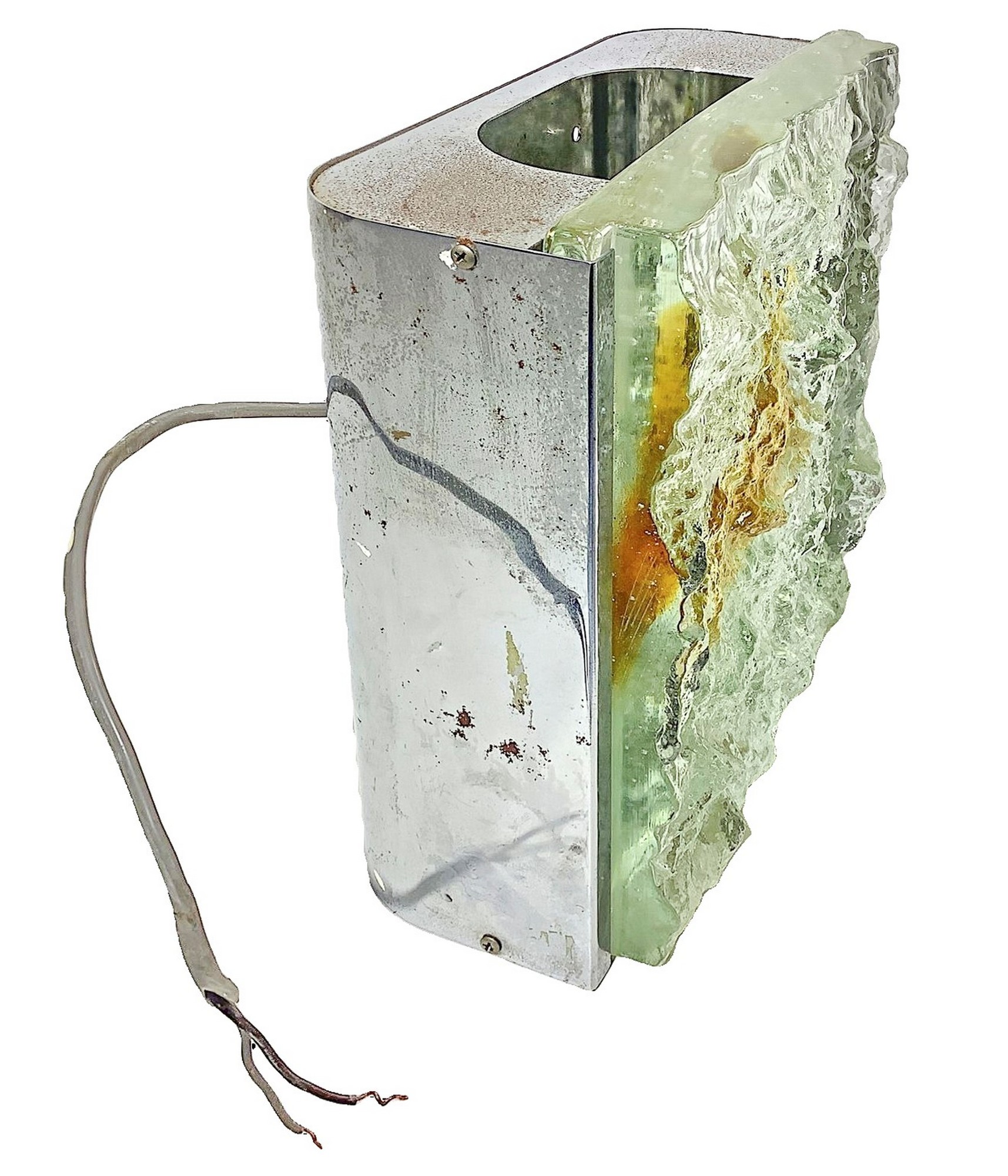 Coppia di appliques, 70's cm 23 x cm 23 x cm 7 Di produzione muranese nello stile Mazzega. Forma quadrata con struttura in metallo cromato, diffusore in vetro di forte spessore con inclusioni di pasta vitrea nei toni dell'ambra . Superficie con lavorazione a finitura ghiacciata. Segni d'uso e tracce di ossido.