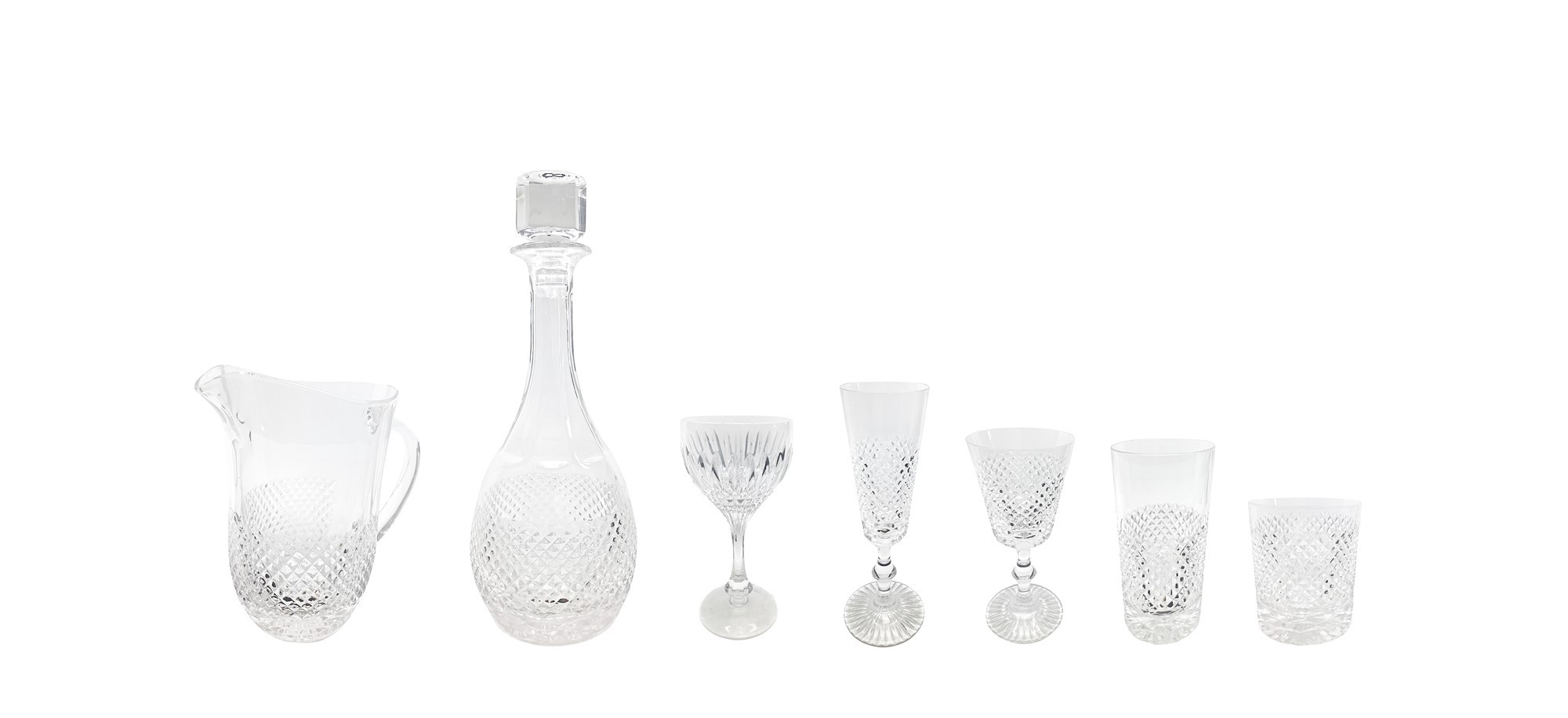 Servizio di bicchieri di cristallo, Cristalleria Persichino, servizio “Ascot" composto da: 12 bicchieri vino, 12 bicchieri acqua, 12 bicchieri champagne, 12 bicchieri whisky, 6 bicchieri cognac, 1 bottiglia, 1 brocca.