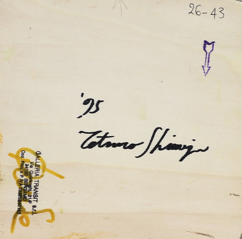 SHIMIZO TETSURO (n. 1958) Senza titolo. 1995. Olio su tela applicata su tavola. Cm 19,00 x 19,00. Al retro firma, data e timbro Galleria Transit Bergamo.