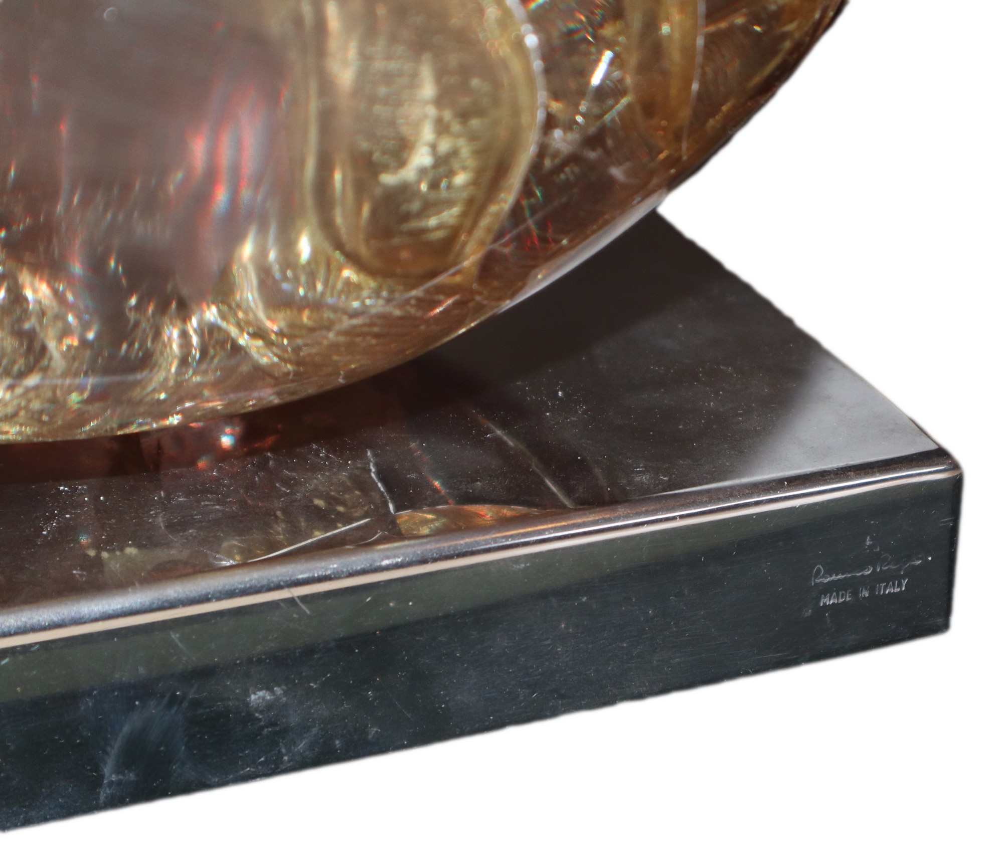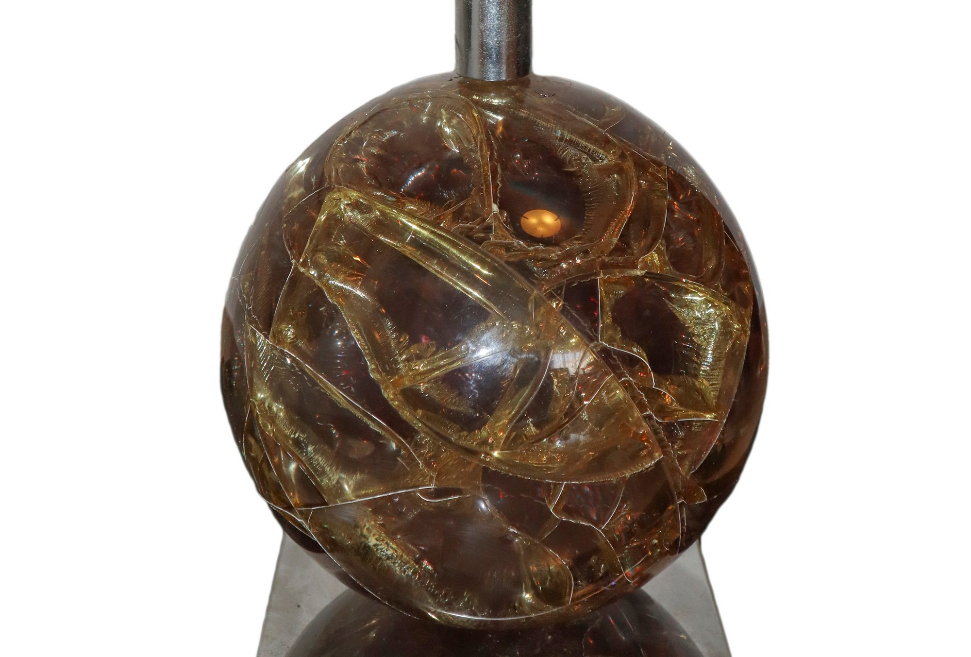 Romeo Rega - Lampada con struttura in metallo cromato e corpo a guida di sfera in plexiglass, 60's diametro cm 65, h cm 27 Lampada trasparente nei toni del pagliesco chiaro con effetto esploso. Marchio della manifattura inciso alla base.Segni d uso. Da rielettrificare