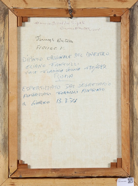 FANTUZZI ELIANO (1909 - 1987) Senza titolo. Olio su tela . Cm 50,00 x 70,00. Firma in basso a sinistra. Al retro garanzia di autenticità a cura dell'esperto Formigli Antonio. Cornice presente