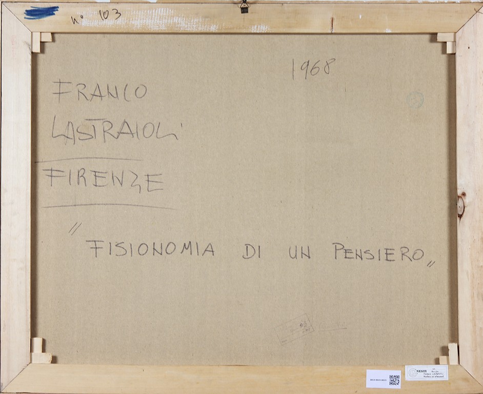 LASTRAIOLI FRANCO (n. 1931) Fisionomia di un pensiero. 1968. Olio su tela . Cm 80,00 x 100,00. Firma e data in basso a destra. Al retro firma, titolo e data. Cornice presente